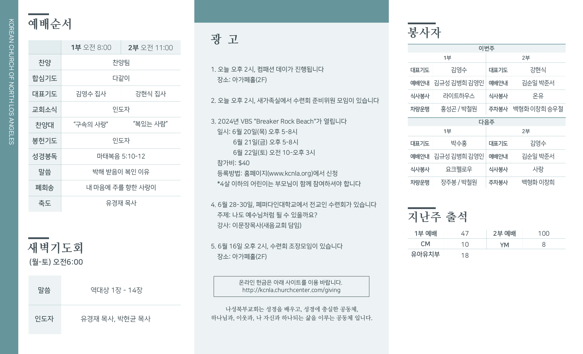 2024년 6월 2일 교회주보 페이지 정보 작성자 나성북부교회 댓글 0건 조회 3,436회 작성일 24-06-04 11:43 목록 본문 2024년 6월 2일 교회주보 이전글2024년 6월 9일 교회주보 24.06.11 다음글2024년 5월 26일 교회주보 24.05.28 목록 댓글 0 댓글목록 등록된 댓글이 없습니다.