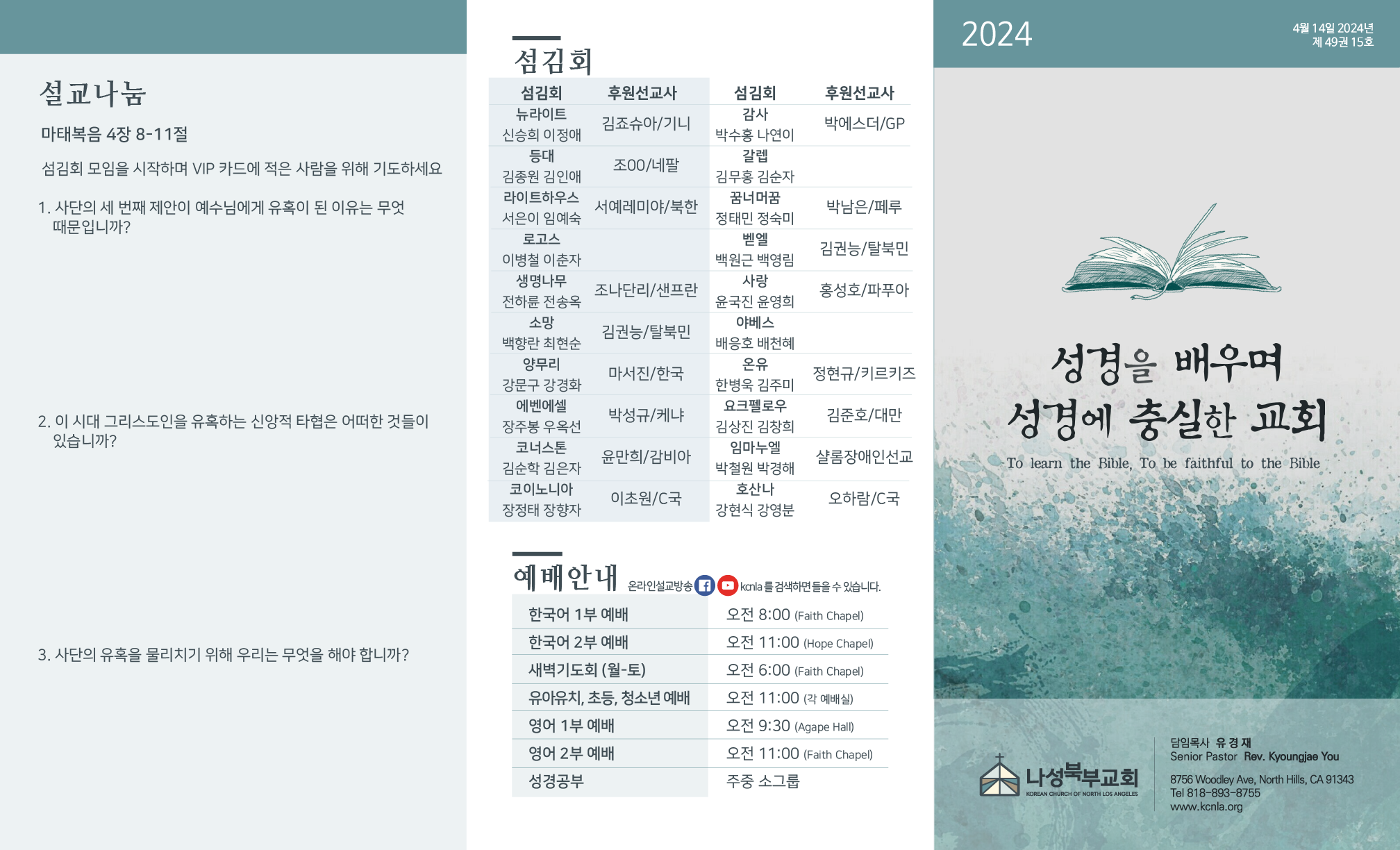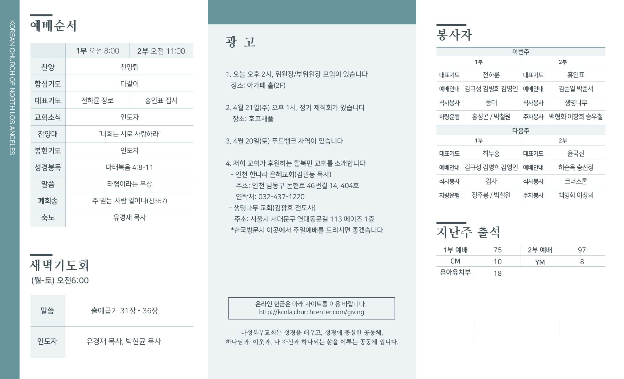 2024년 4월 14일 교회주보 페이지 정보 작성자 나성북부교회 댓글 0건 조회 4,250회 작성일 24-04-17 12:59 목록 본문 2024년 4월 14일 교회주보 이전글2024년 4월 21일 교회주보 24.04.24 다음글2024년 4월 7일 교회주보 24.04.10 목록 댓글 0 댓글목록 등록된 댓글이 없습니다.