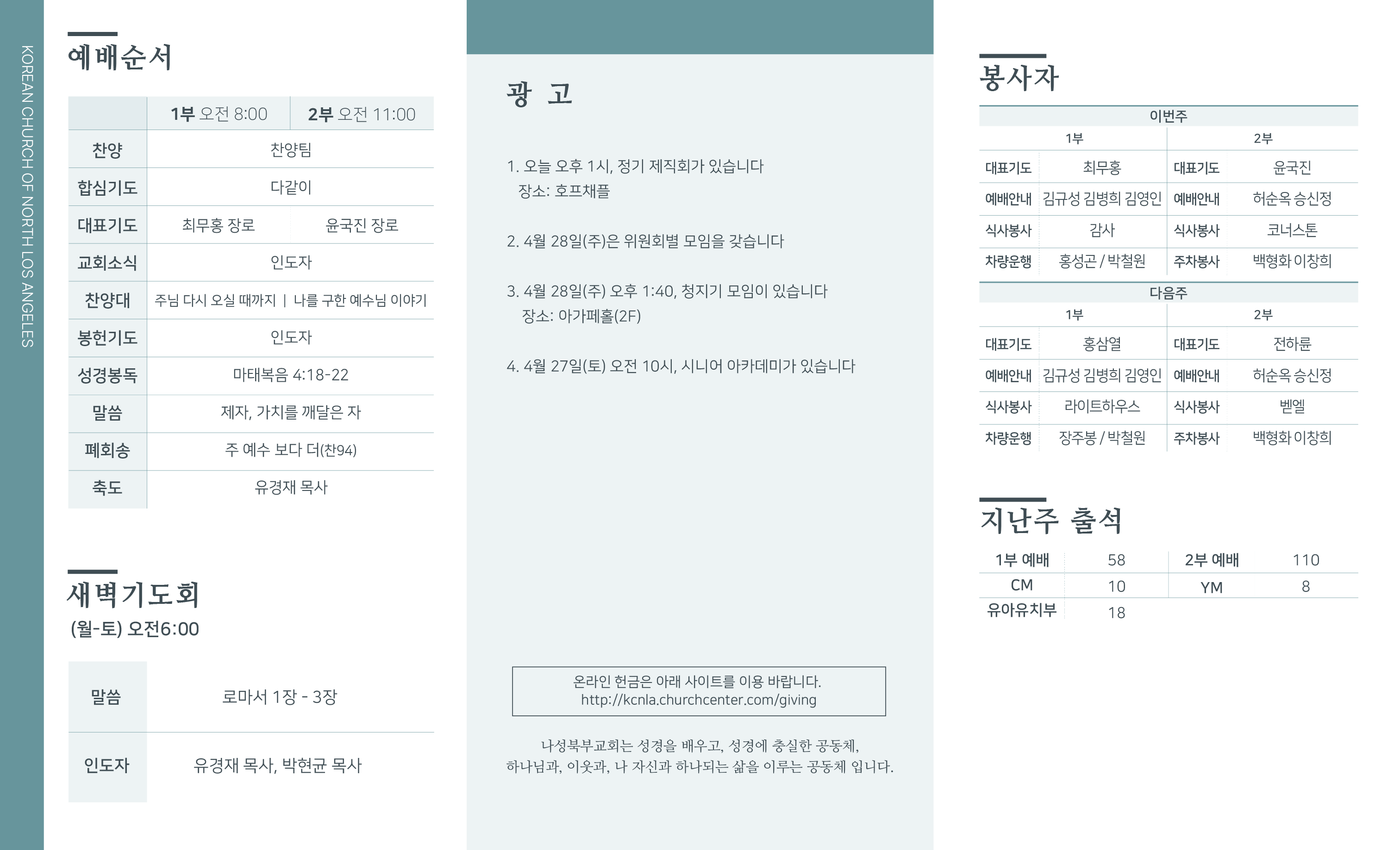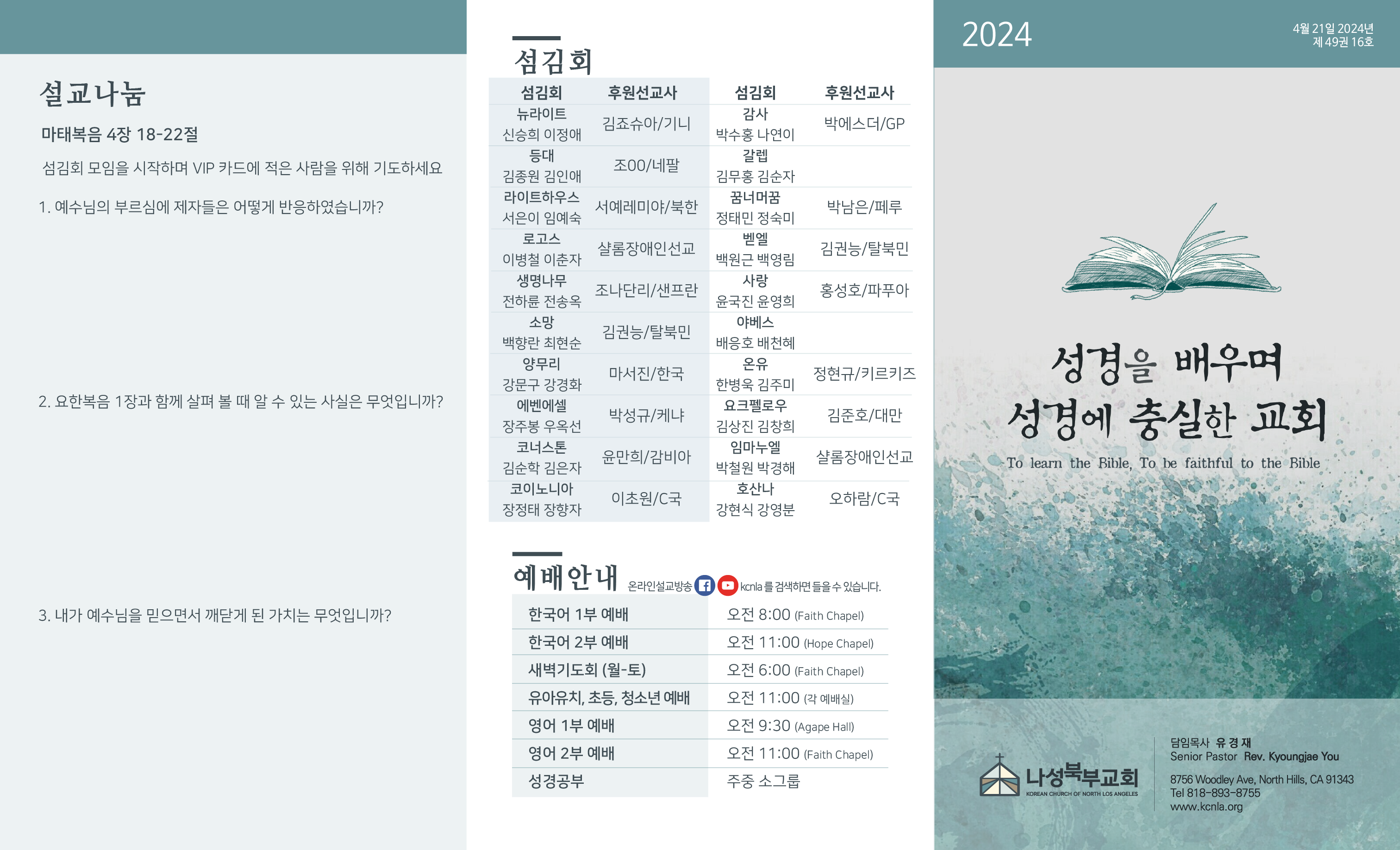2024년 4월 21일 교회주보 페이지 정보 작성자 나성북부교회 댓글 0건 조회 4,323회 작성일 24-04-24 08:45 목록 본문 2024년 4월 21일 교회주보 이전글2024년 4월 28일 교회주보 24.05.01 다음글2024년 4월 14일 교회주보 24.04.17 목록 댓글 0 댓글목록 등록된 댓글이 없습니다.