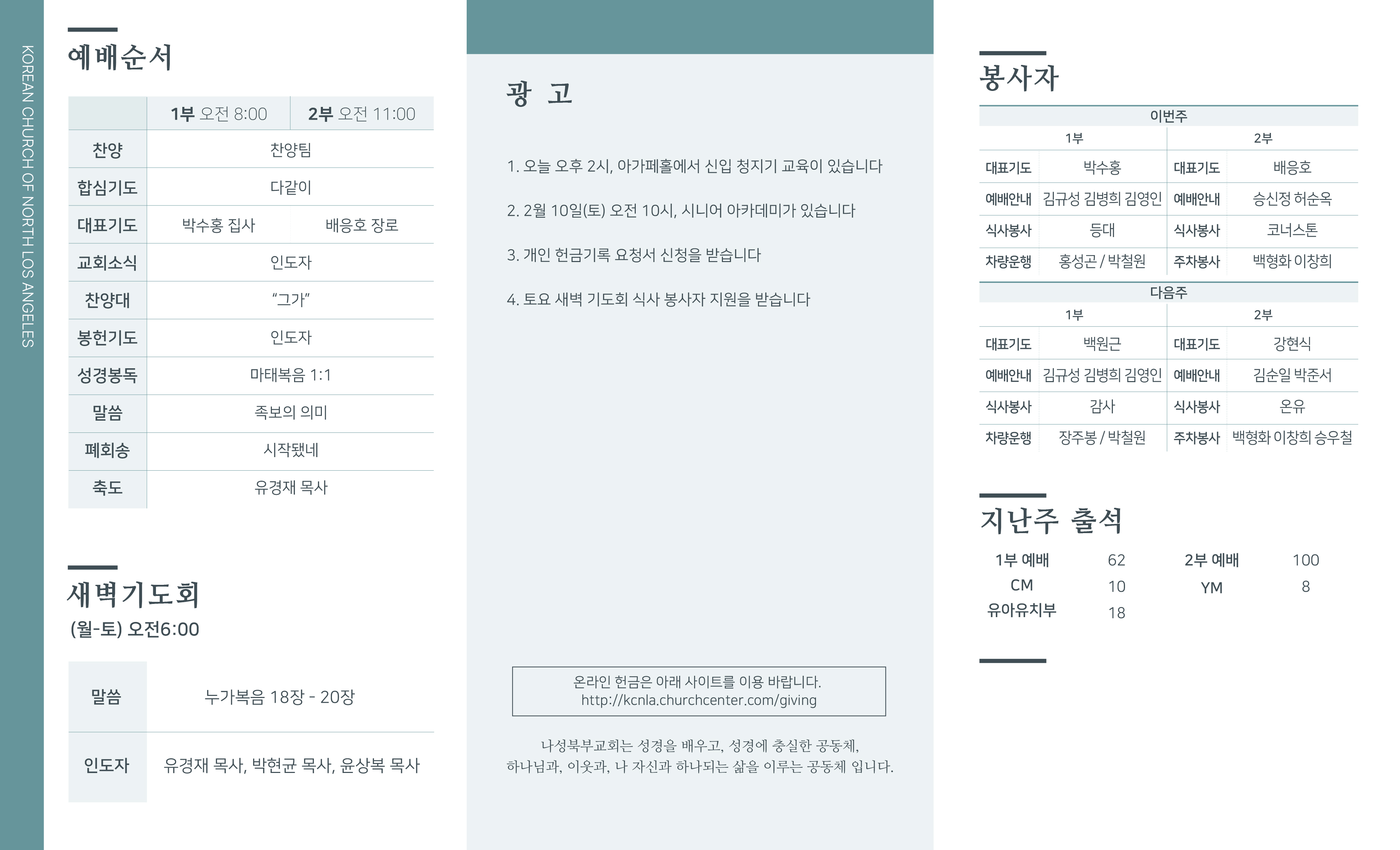 2024년 2월 4일 교회주보 페이지 정보 작성자 나성북부교회 댓글 0건 조회 3,473회 작성일 24-02-04 15:11 목록 본문 2024년 2월 4일 교회주보 이전글2024년 2월 11일 교회주보 24.02.11 다음글2024년 1월 28일 교회주보 24.01.30 목록 댓글 0 댓글목록 등록된 댓글이 없습니다.
