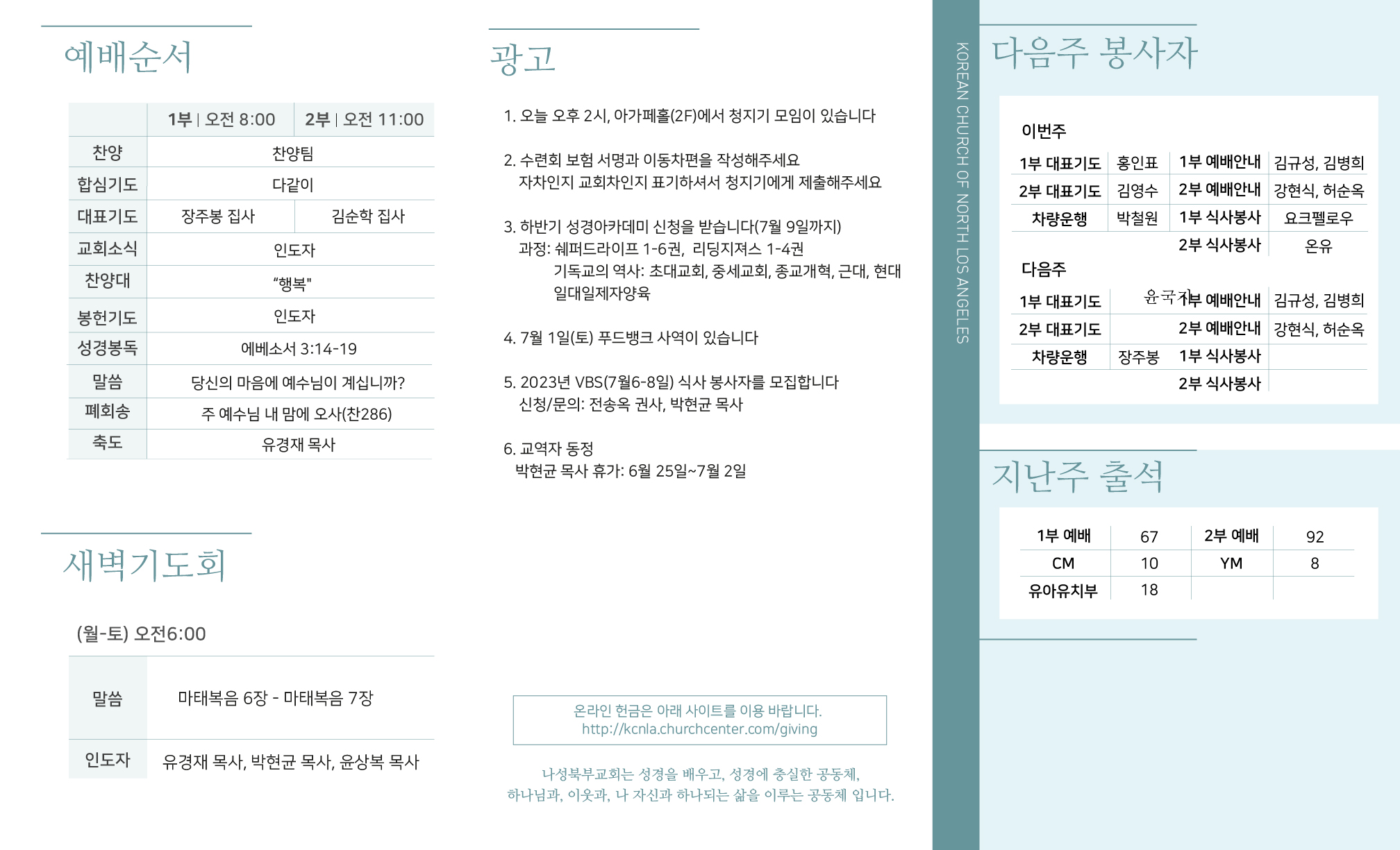 2023년 6월 25일 교회주보 페이지 정보 작성자 나성북부교회 댓글 0건 조회 4,716회 작성일 23-07-07 19:44 목록 본문 2023년 6월 25일 교회주보 이전글2023년 7월 2일 교회주보 23.07.07 다음글2023년 6월 18일 교회주보 23.06.18 목록 댓글 0 댓글목록 등록된 댓글이 없습니다.