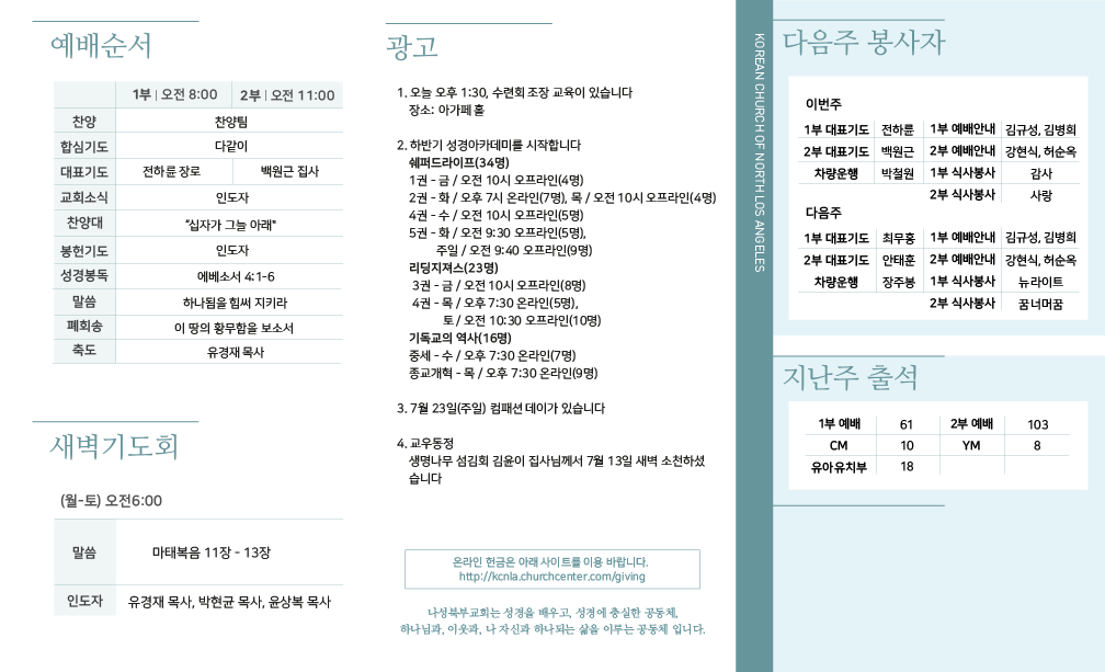 2023년 7월 16일 교회주보 페이지 정보 작성자 나성북부교회 댓글 0건 조회 5,263회 작성일 23-07-18 08:59 목록 본문 2023년 7월 16일 교회주보 이전글2023년 7월 23일 교회주보 23.07.25 다음글2023년 7월 9일 교회주보 23.07.12 목록 댓글 0 댓글목록 등록된 댓글이 없습니다.