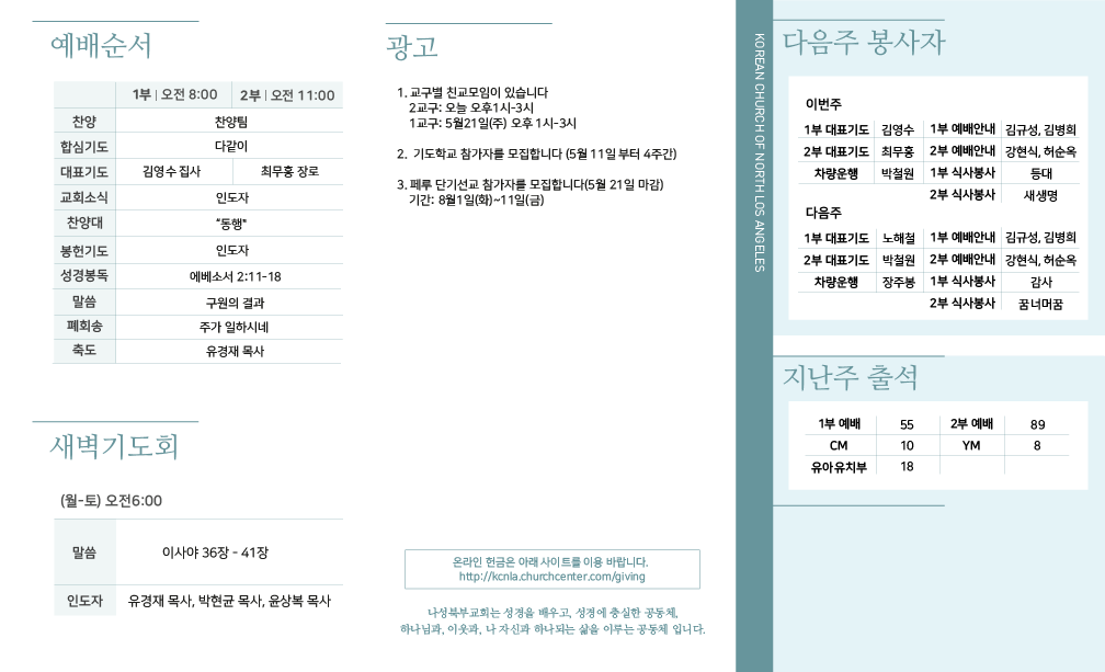 2023년 5월 7일 교회주보 페이지 정보 작성자 나성북부교회 댓글 0건 조회 4,764회 작성일 23-05-13 10:17 목록 본문 2023년 5월 7일 교회주보 이전글2023년 5월 14일 교회주보 23.05.13 다음글2023년 4월 30일 교회주보 23.04.29 목록 댓글 0 댓글목록 등록된 댓글이 없습니다.
