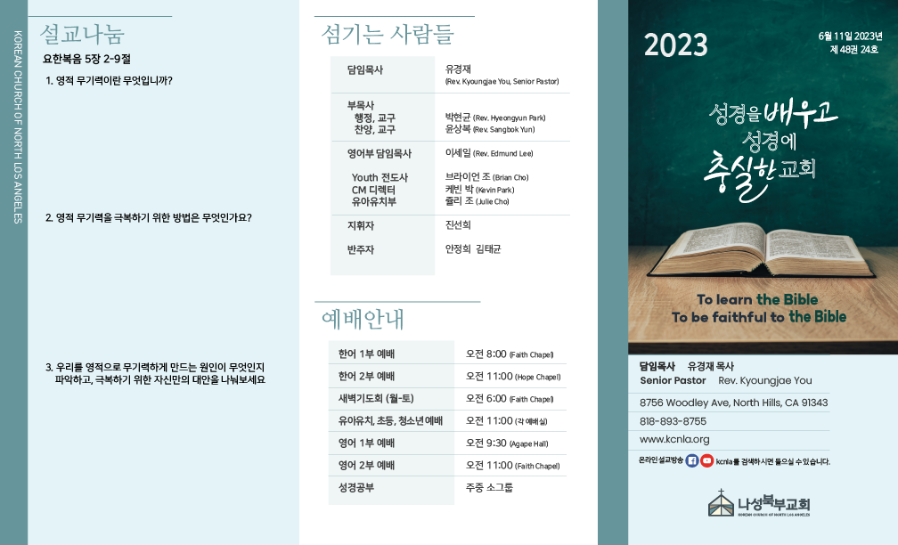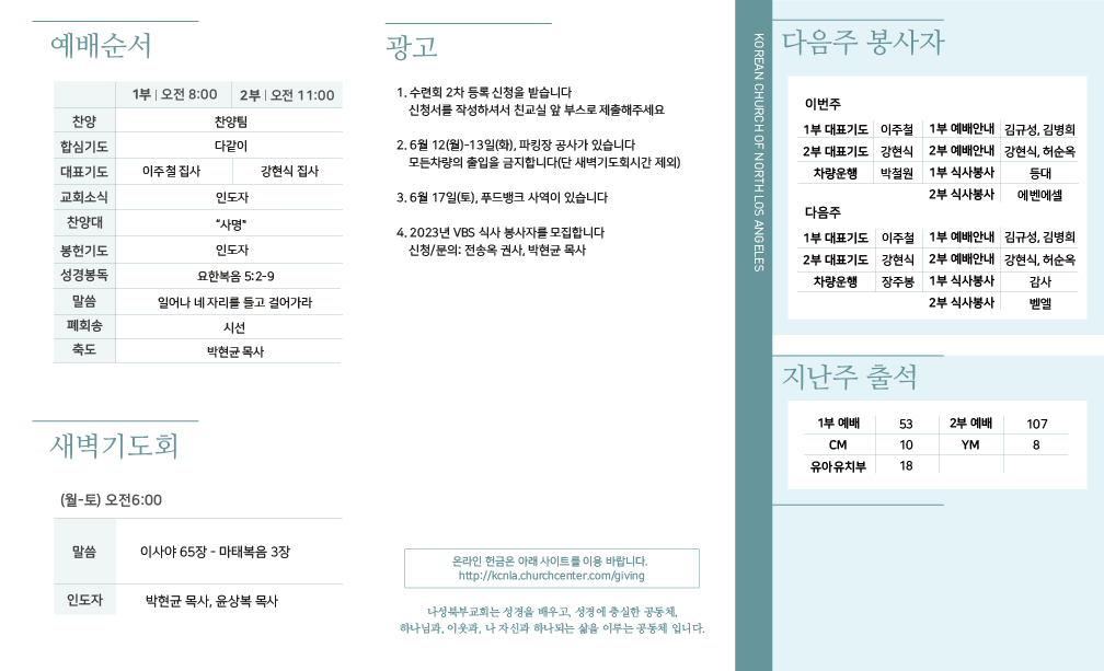 2023년 6월 11일 교회주보 페이지 정보 작성자 나성북부교회 댓글 0건 조회 5,329회 작성일 23-06-10 12:02 목록 본문 2023년 6월 11일 교회주보 이전글2023년 6월 18일 교회주보 23.06.18 다음글2023년 6월 4일 교회주보 23.06.03 목록 댓글 0 댓글목록 등록된 댓글이 없습니다.