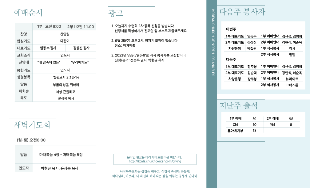 2023년 6월 18일 교회주보 페이지 정보 작성자 나성북부교회 댓글 0건 조회 5,392회 작성일 23-06-18 12:51 목록 본문 2023년 6월 18일 교회주보 이전글2023년 6월 25일 교회주보 23.07.07 다음글2023년 6월 11일 교회주보 23.06.10 목록 댓글 0 댓글목록 등록된 댓글이 없습니다.