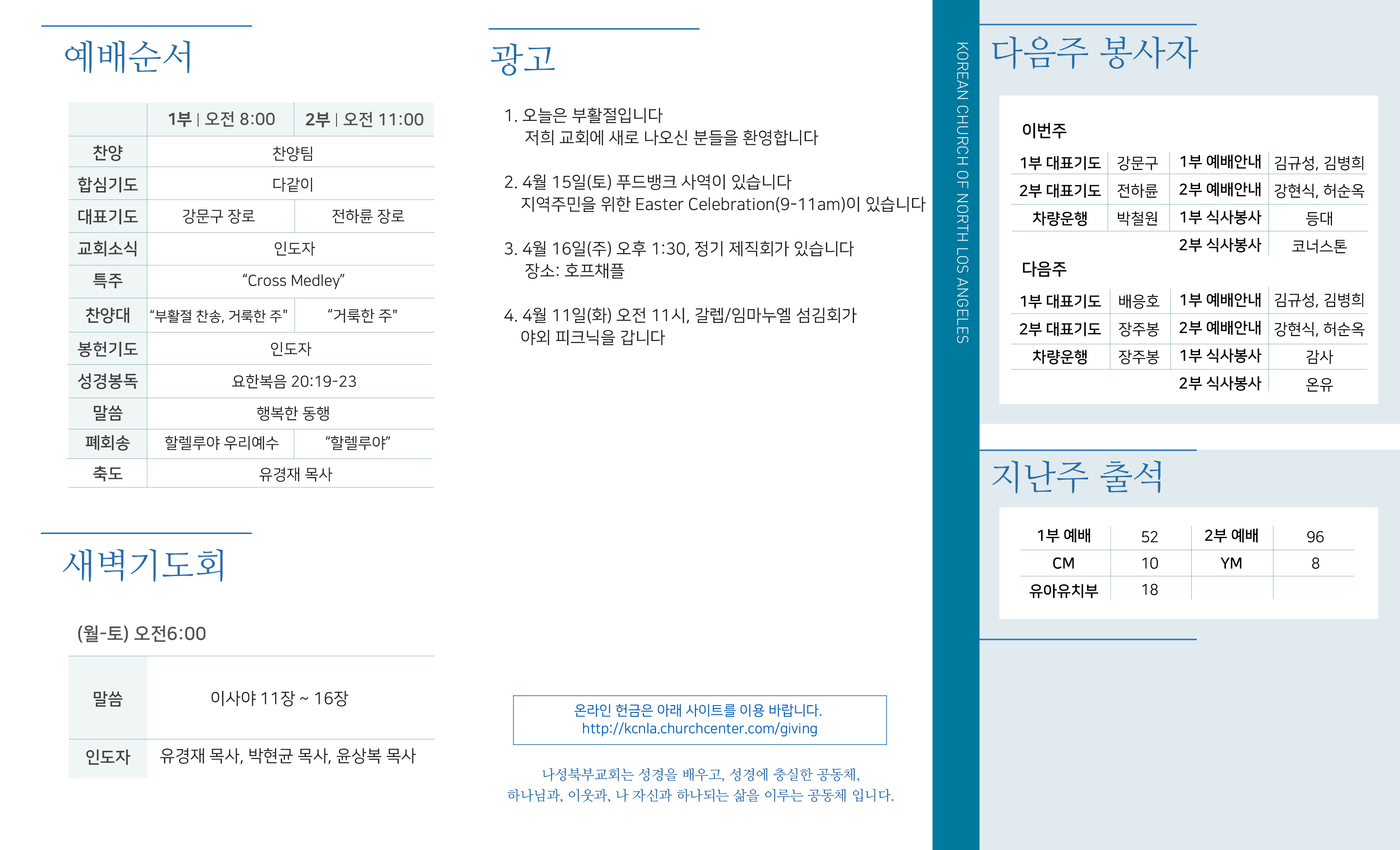 2023년 4월 9일 교회주보 페이지 정보 작성자 나성북부교회 댓글 0건 조회 5,412회 작성일 23-04-14 12:20 목록 본문 2023년 4월 9일 교회주보 이전글2023년 4월 16일 교회주보 23.04.15 다음글2023년 4월 2일 교회주보 23.04.01 목록 댓글 0 댓글목록 등록된 댓글이 없습니다.