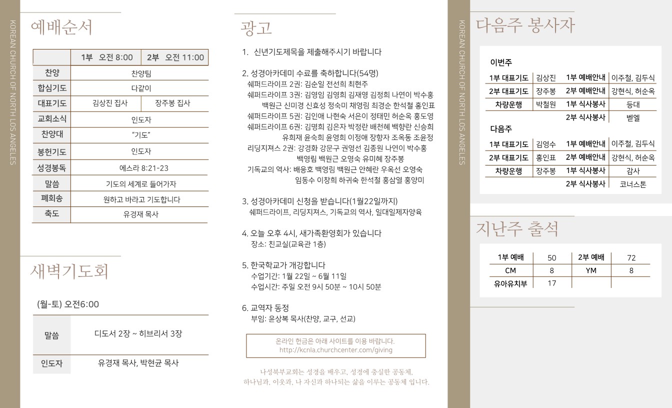 2023년 1월 8일 교회주보 페이지 정보 작성자 나성북부교회 댓글 0건 조회 5,714회 작성일 23-01-07 11:44 목록 본문 2023년 1월 8일 교회주보 이전글2023년 1월 15일 교회주보 23.01.14 다음글2023년 1월 1일 교회주보 22.12.31 목록 댓글 0 댓글목록 등록된 댓글이 없습니다.