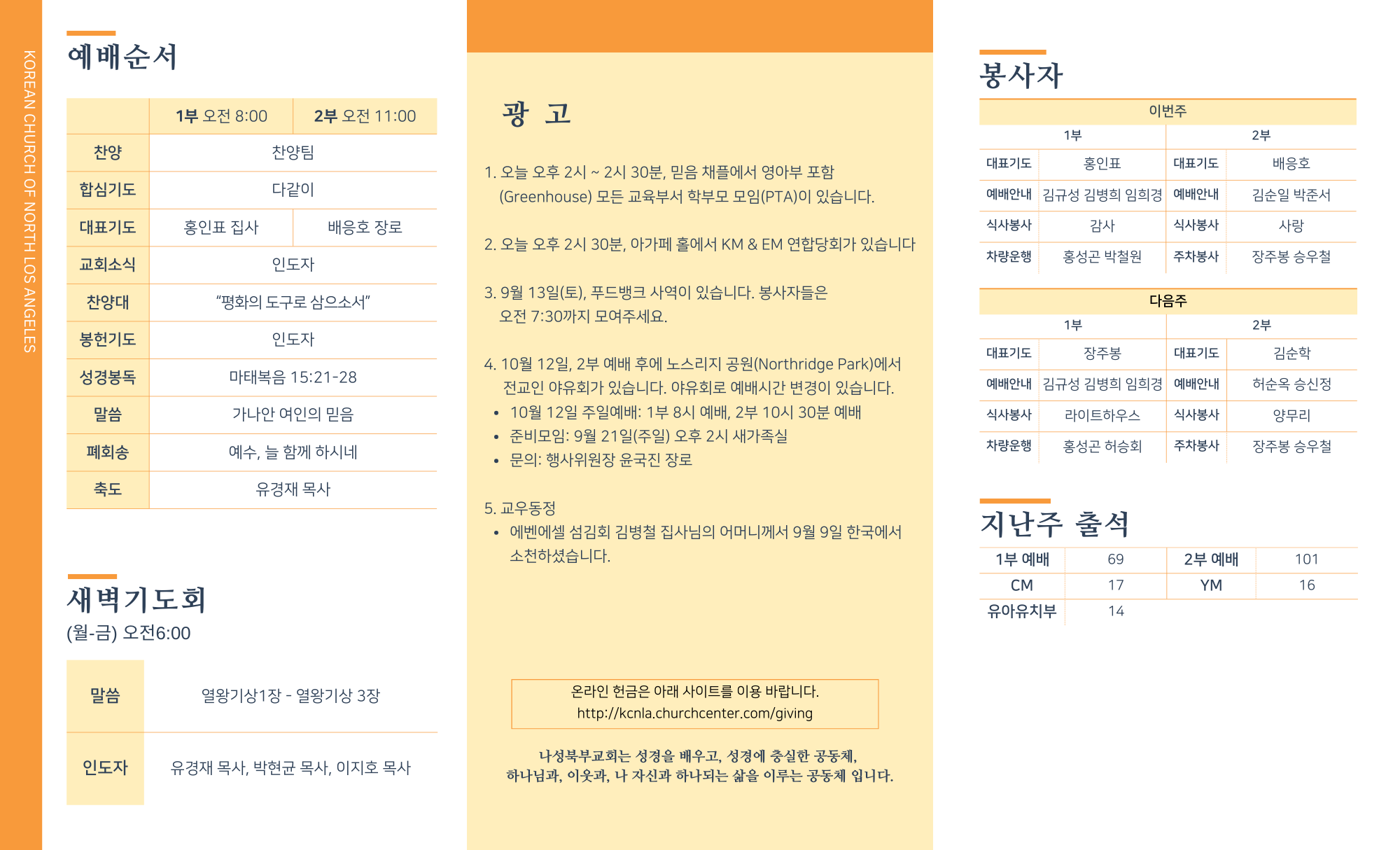 2025년 9월 14일 교회주보 페이지 정보 작성자 나성북부교회 댓글 0건 조회 1,497회 작성일 25-09-13 09:05 목록 본문 2025년 9월 14일 교회주보 이전글2025년 9월 21일 교회주보 25.09.20 다음글2025년 9월 7일 교회주보 25.09.06 목록 댓글 0 댓글목록 등록된 댓글이 없습니다.