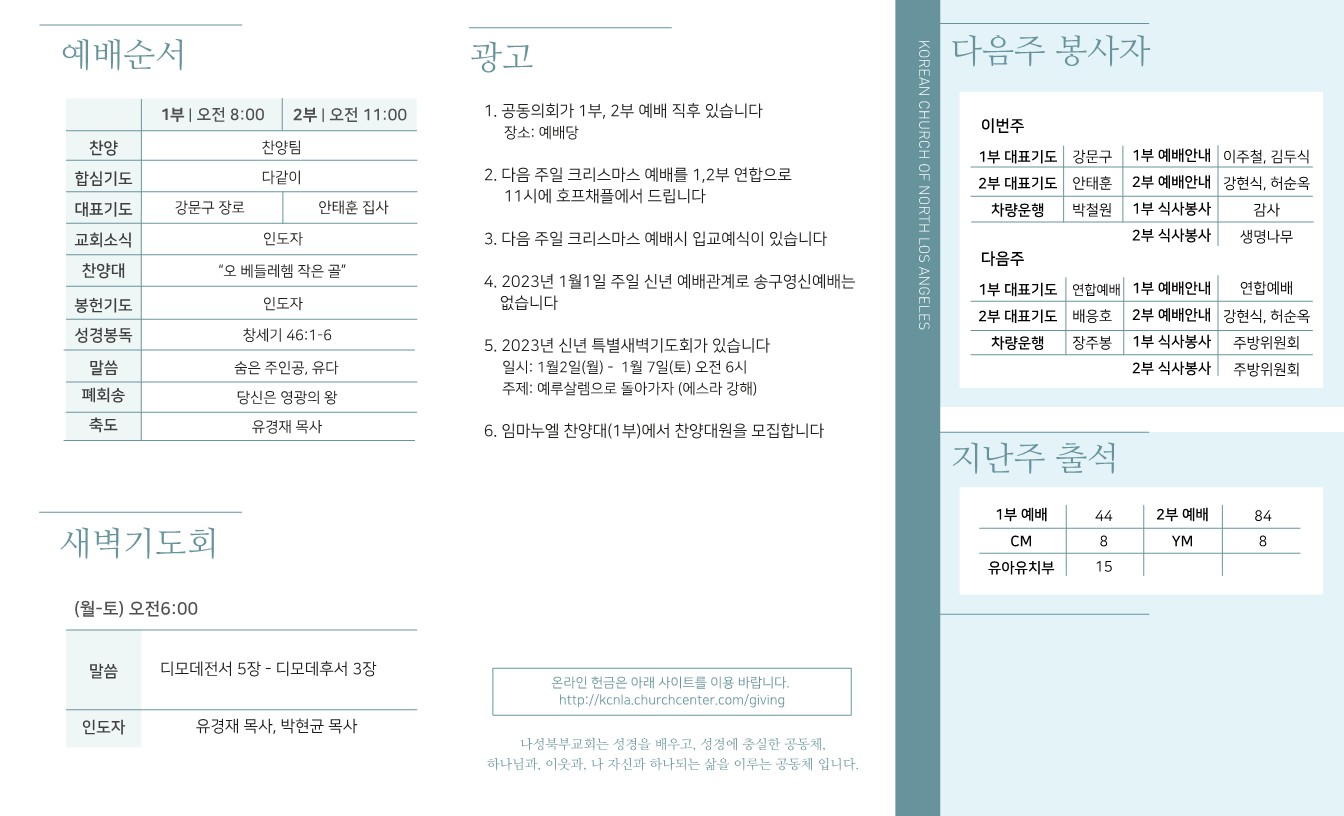 2022년 12월 18일 교회주보 페이지 정보 작성자 나성북부교회 댓글 0건 조회 5,416회 작성일 22-12-17 11:11 목록 본문 2022년 12월 18일 교회주보 이전글2022년 12월 25일 교회주보 22.12.24 다음글2022년 12월 11일 교회주보 22.12.17 목록 댓글 0 댓글목록 등록된 댓글이 없습니다.