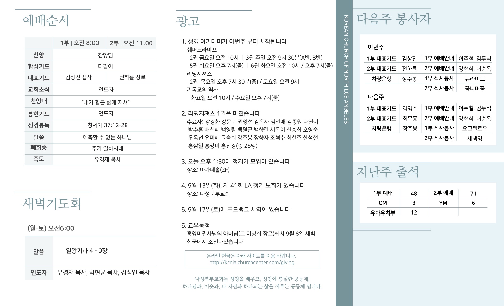 2022년 9월 11일 교회주보 페이지 정보 작성자 나성북부교회 댓글 0건 조회 5,371회 작성일 22-09-10 10:58 목록 본문 2022년 9월 11일 교회주보 이전글2022년 9월 18일 교회주보 22.09.17 다음글2022년 9월 4일 교회주보 22.09.03 목록 댓글 0 댓글목록 등록된 댓글이 없습니다.