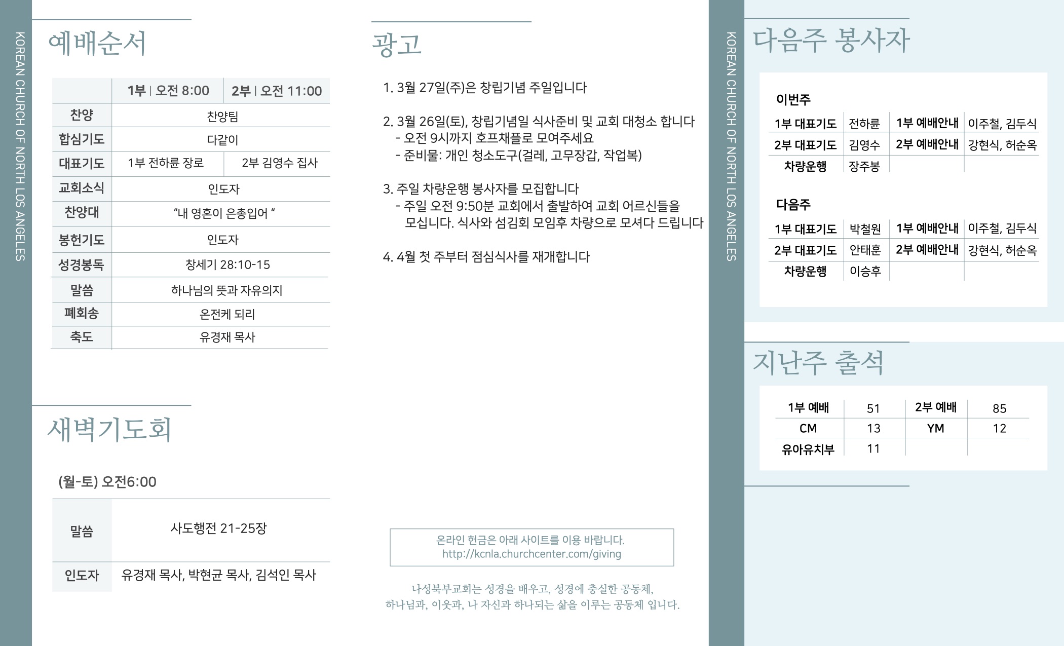 2022년 3월 20일 교회주보 페이지 정보 작성자 kcnla 댓글 0건 조회 6,437회 작성일 22-03-19 10:27 목록 본문 2022년 3월 20일 교회주보 이전글2022년 3월 27일 교회주보 22.03.25 다음글2022년 3월 13일 교회주보 22.03.12 목록 댓글 0 댓글목록 등록된 댓글이 없습니다.
