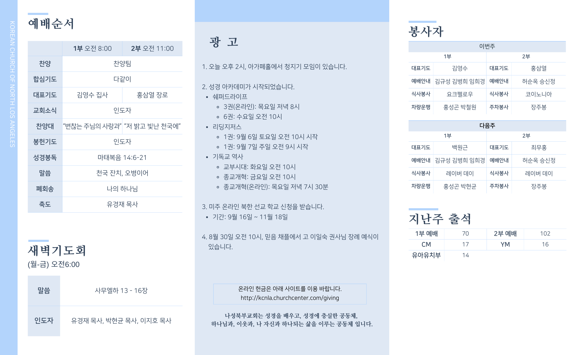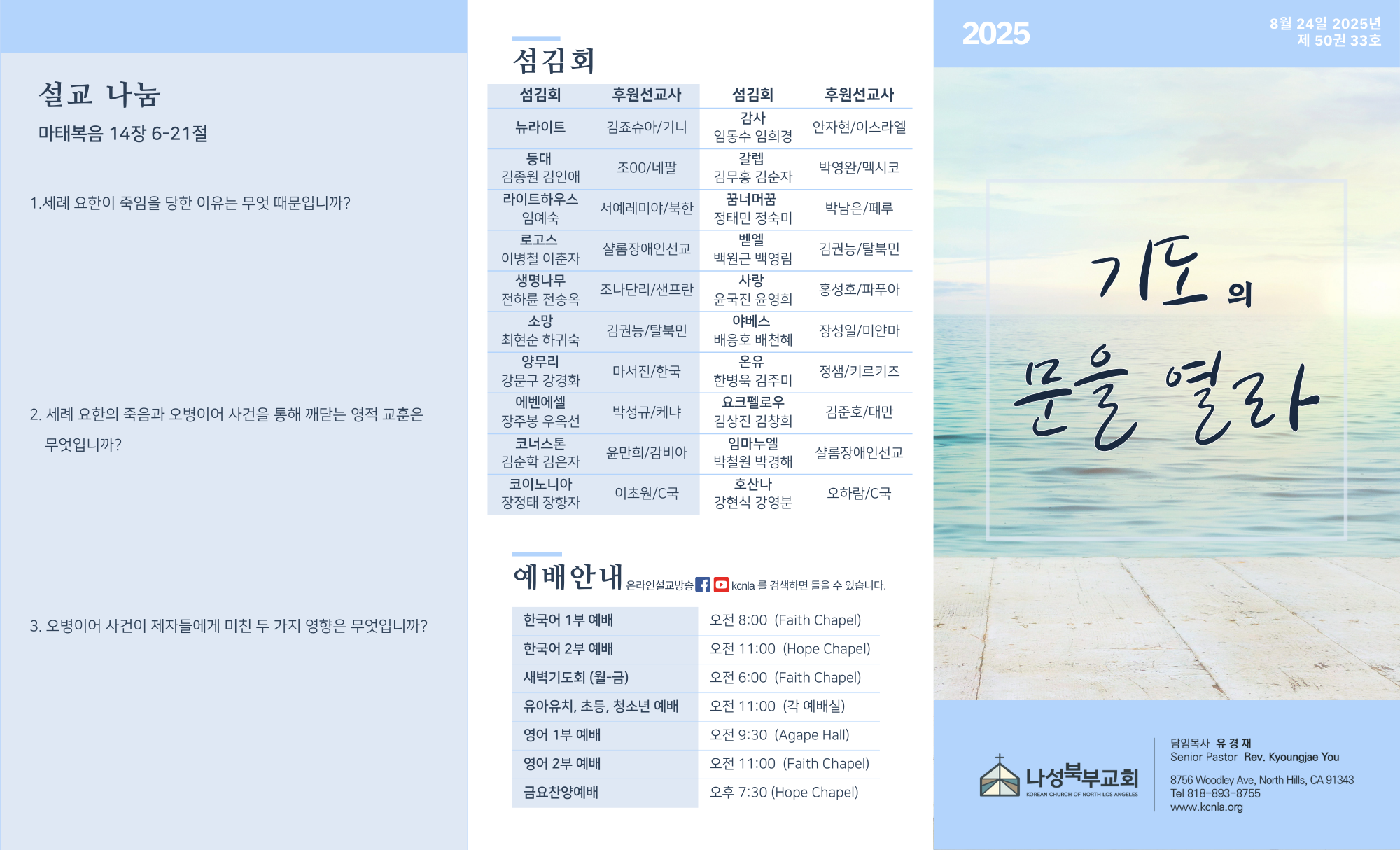 2025년 8월 24일 교회주보 페이지 정보 작성자 나성북부교회 댓글 0건 조회 1,609회 작성일 25-08-23 09:25 목록 본문 2025년 8월 24일 교회주보 이전글2025년 8월 31일 교회주보 25.08.30 다음글2025년 8월 17일 교회주보 25.08.16 목록 댓글 0 댓글목록 등록된 댓글이 없습니다.