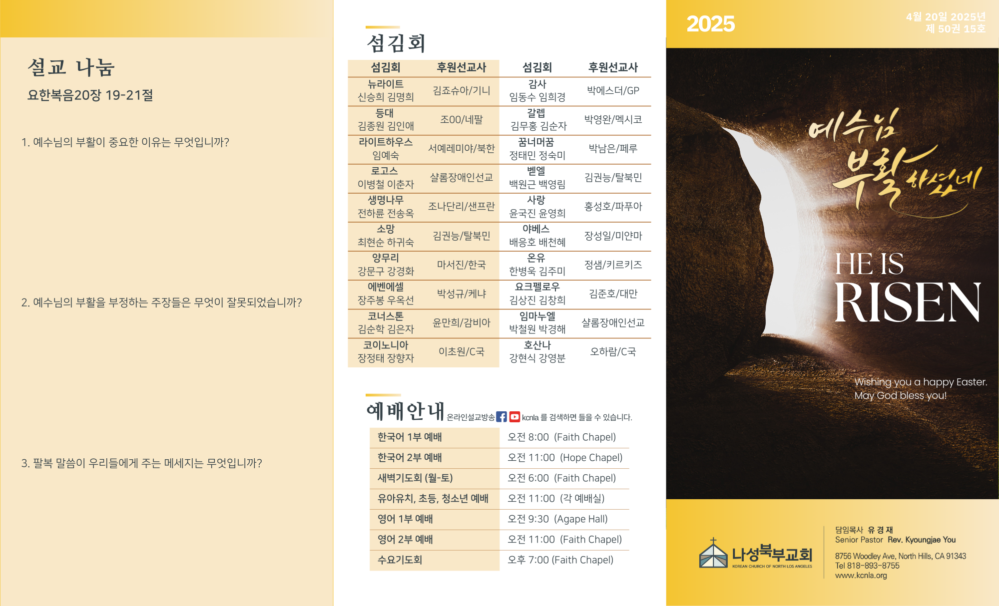 2025년 4월 20일 교회주보 페이지 정보 작성자 나성북부교회 댓글 0건 조회 2,418회 작성일 25-04-19 10:13 목록 본문 2025년 4월 20일 교회주보 이전글2025년 4월 27일 교회주보 25.04.26 다음글2025년 4월 13일 교회주보 25.04.12 목록 댓글 0 댓글목록 등록된 댓글이 없습니다.
