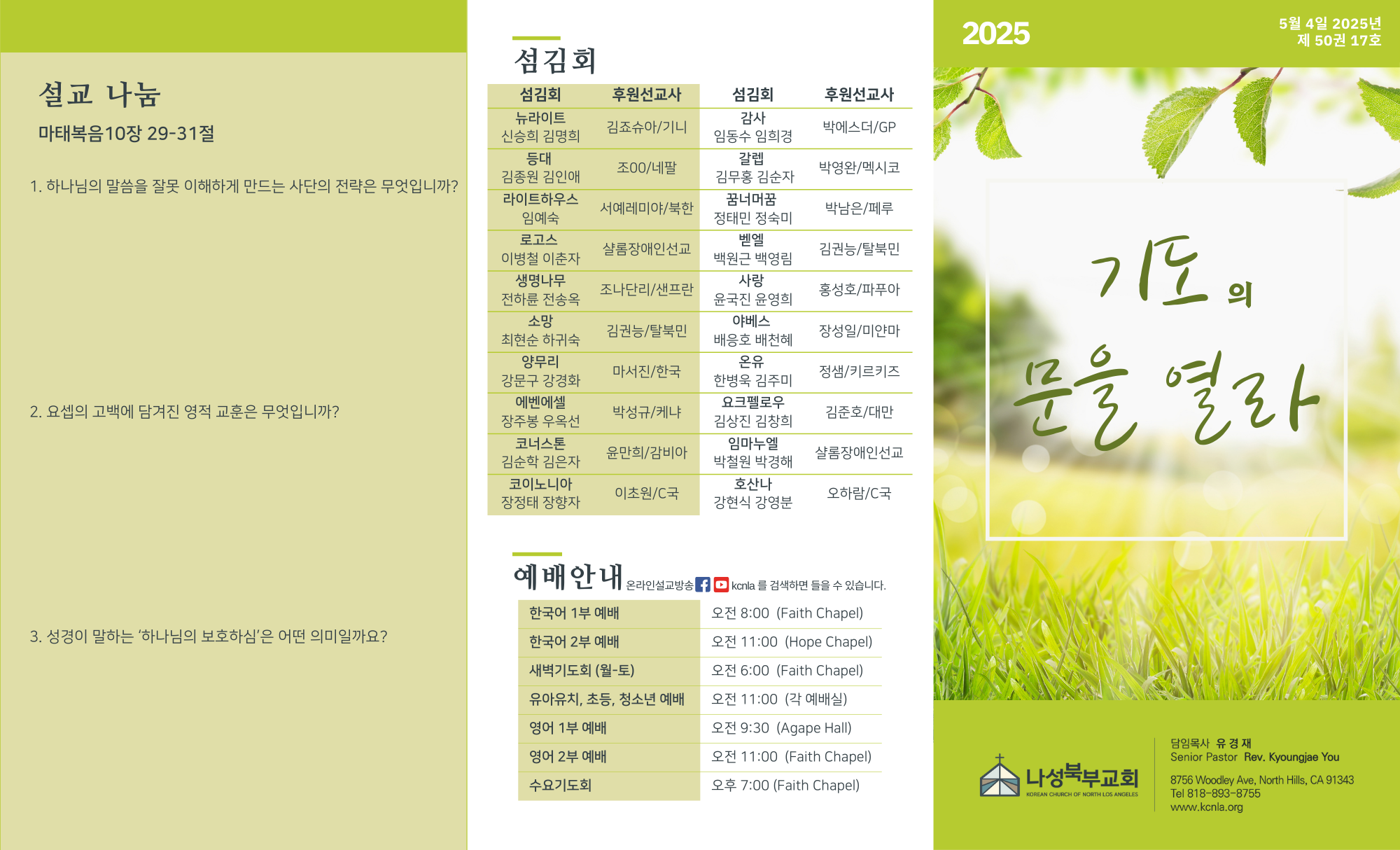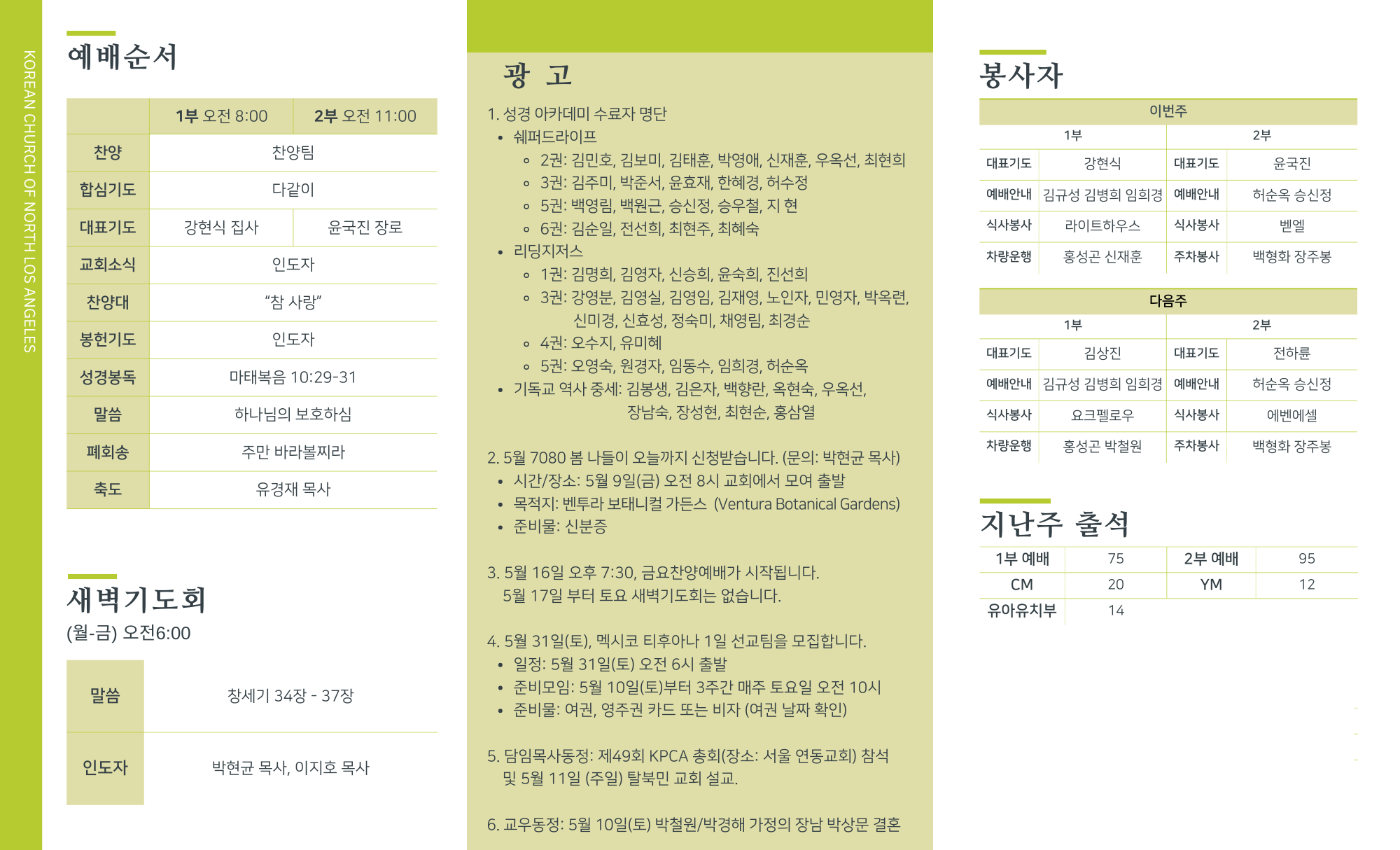 2025년 5월 4일 교회주보 페이지 정보 작성자 나성북부교회 댓글 0건 조회 2,287회 작성일 25-05-03 10:57 목록 본문 2025년 5월 4일 교회주보 이전글2025년 5월 11일 교회주보 25.05.10 다음글2025년 4월 27일 교회주보 25.04.26 목록 댓글 0 댓글목록 등록된 댓글이 없습니다.
