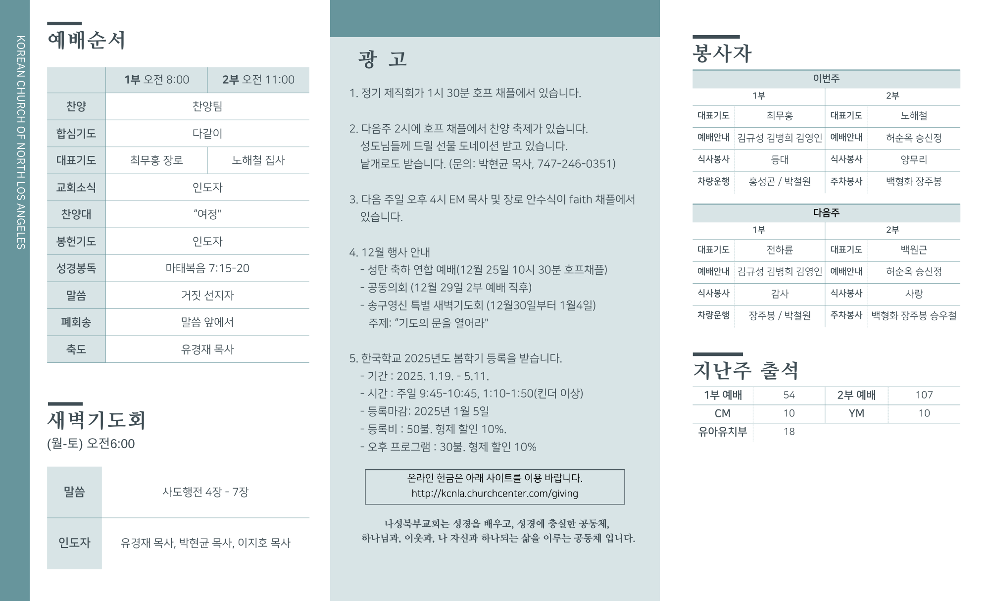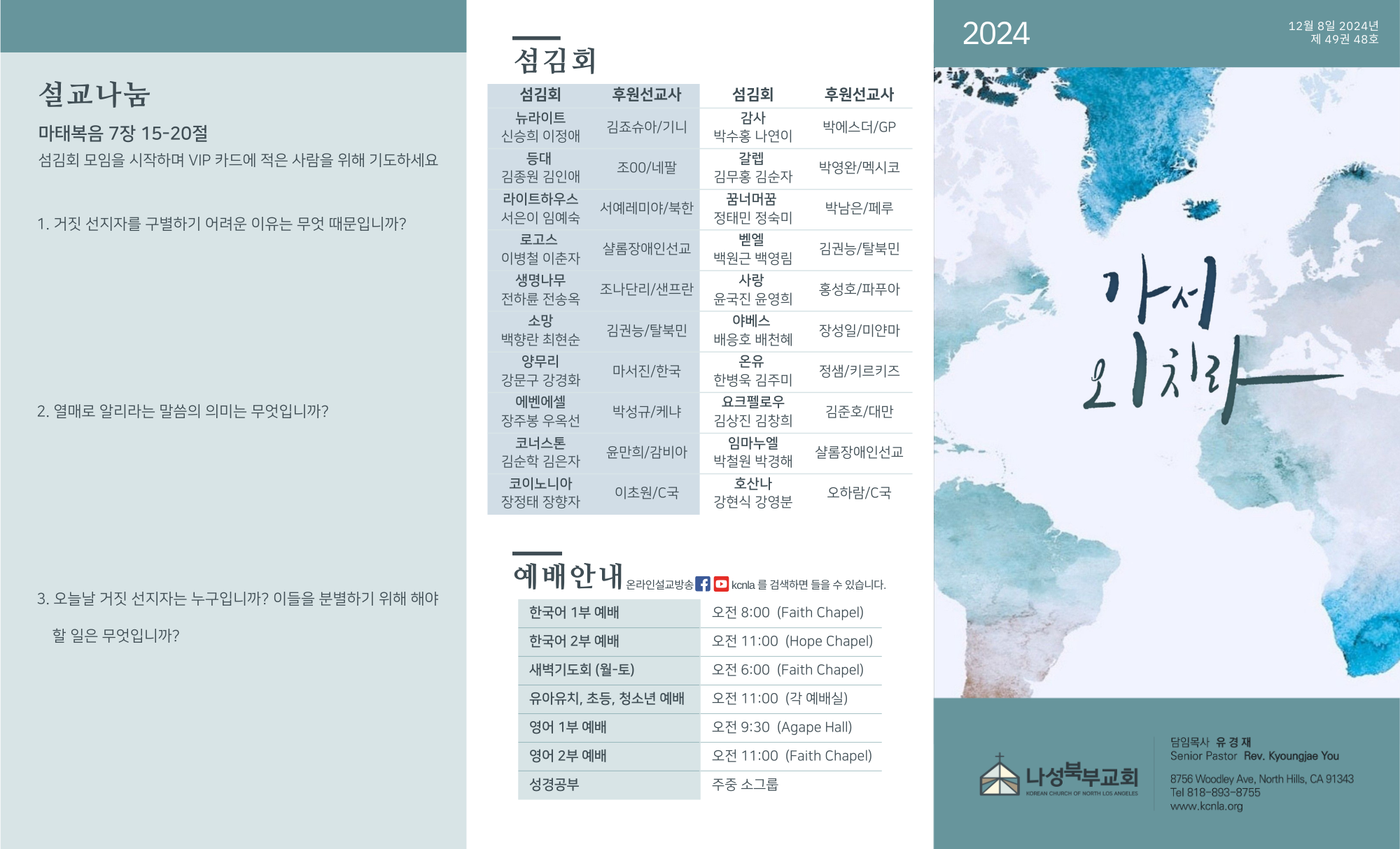 2024년 12월 8일 교회주보 페이지 정보 작성자 나성북부교회 댓글 0건 조회 3,269회 작성일 24-12-07 11:03 목록 본문 2024년 12월 8일 교회주보 이전글2024년 12월 15일 교회주보 24.12.14 다음글2024년 12월 1일 교회주보 24.12.01 목록 댓글 0 댓글목록 등록된 댓글이 없습니다.