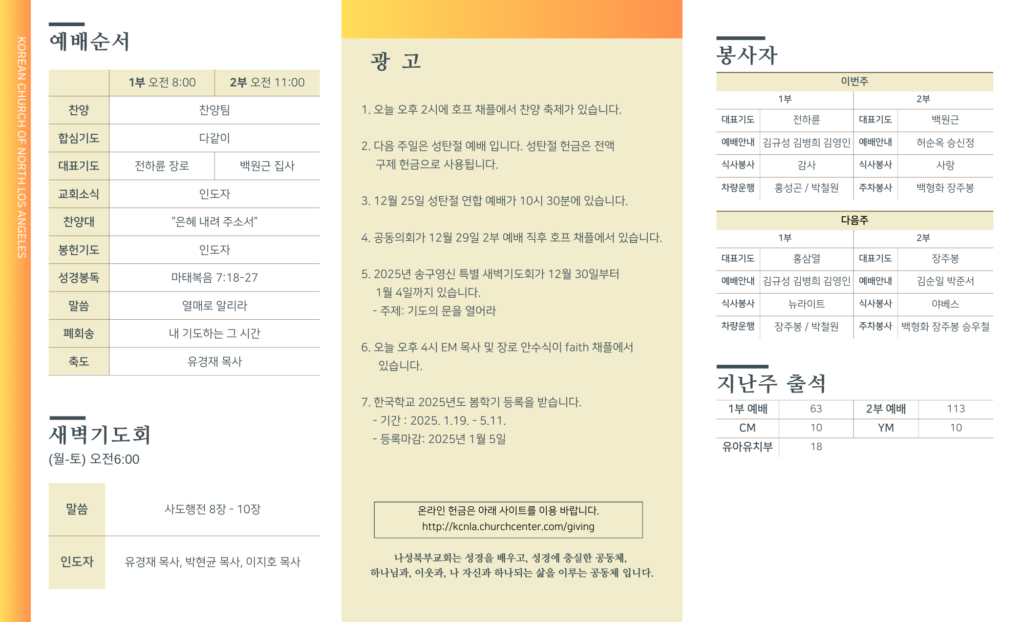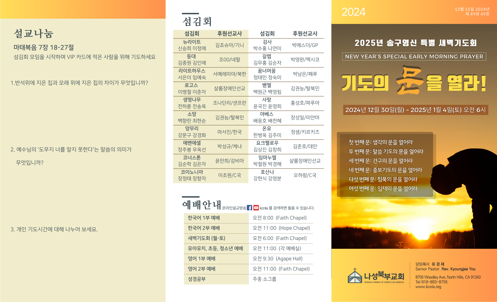 2024년 12월 15일 교회주보 페이지 정보 작성자 나성북부교회 댓글 0건 조회 3,457회 작성일 24-12-14 11:02 목록 본문 2024년 12월 15일 교회주보 이전글2024년 12월 22일 교회주보 24.12.21 다음글2024년 12월 8일 교회주보 24.12.07 목록 댓글 0 댓글목록 등록된 댓글이 없습니다.