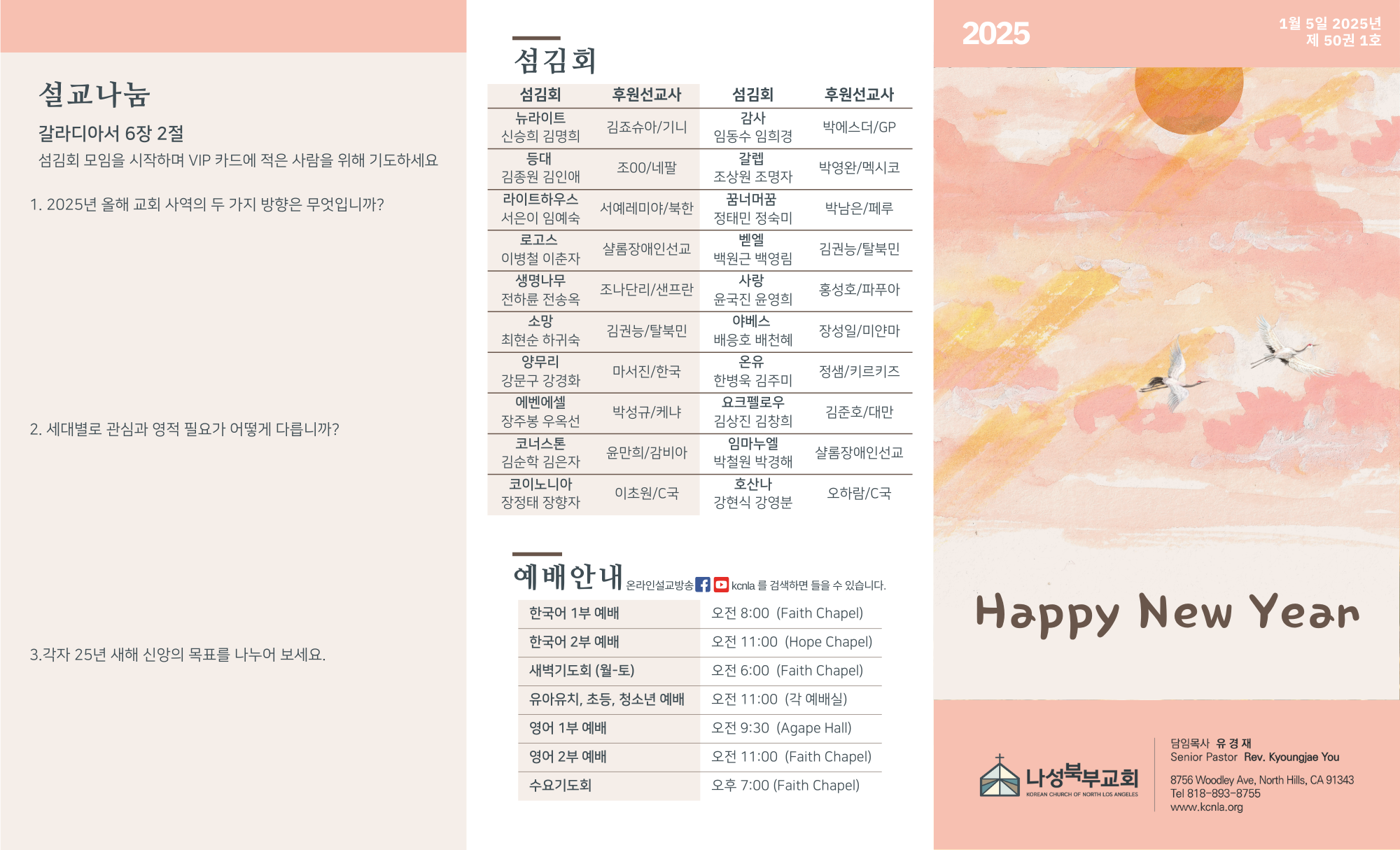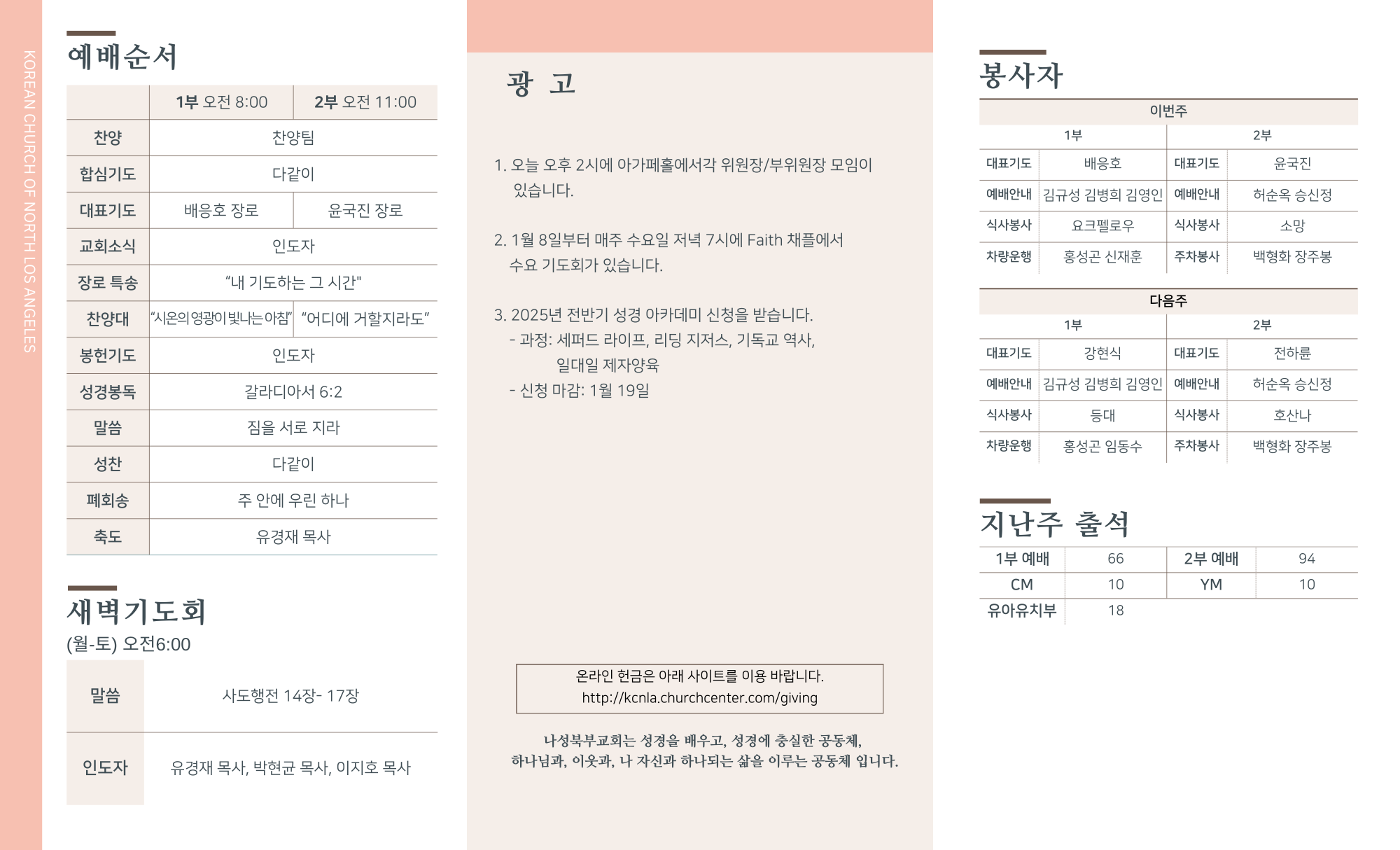 2025년 1월 5일 교회주보 페이지 정보 작성자 나성북부교회 댓글 0건 조회 2,986회 작성일 25-01-04 11:32 목록 본문 2025년 1월 5일 교회주보 이전글2025년 1월 12일 교회주보 25.01.12 다음글2024년 12월 29일 교회주보 25.01.03 목록 댓글 0 댓글목록 등록된 댓글이 없습니다.