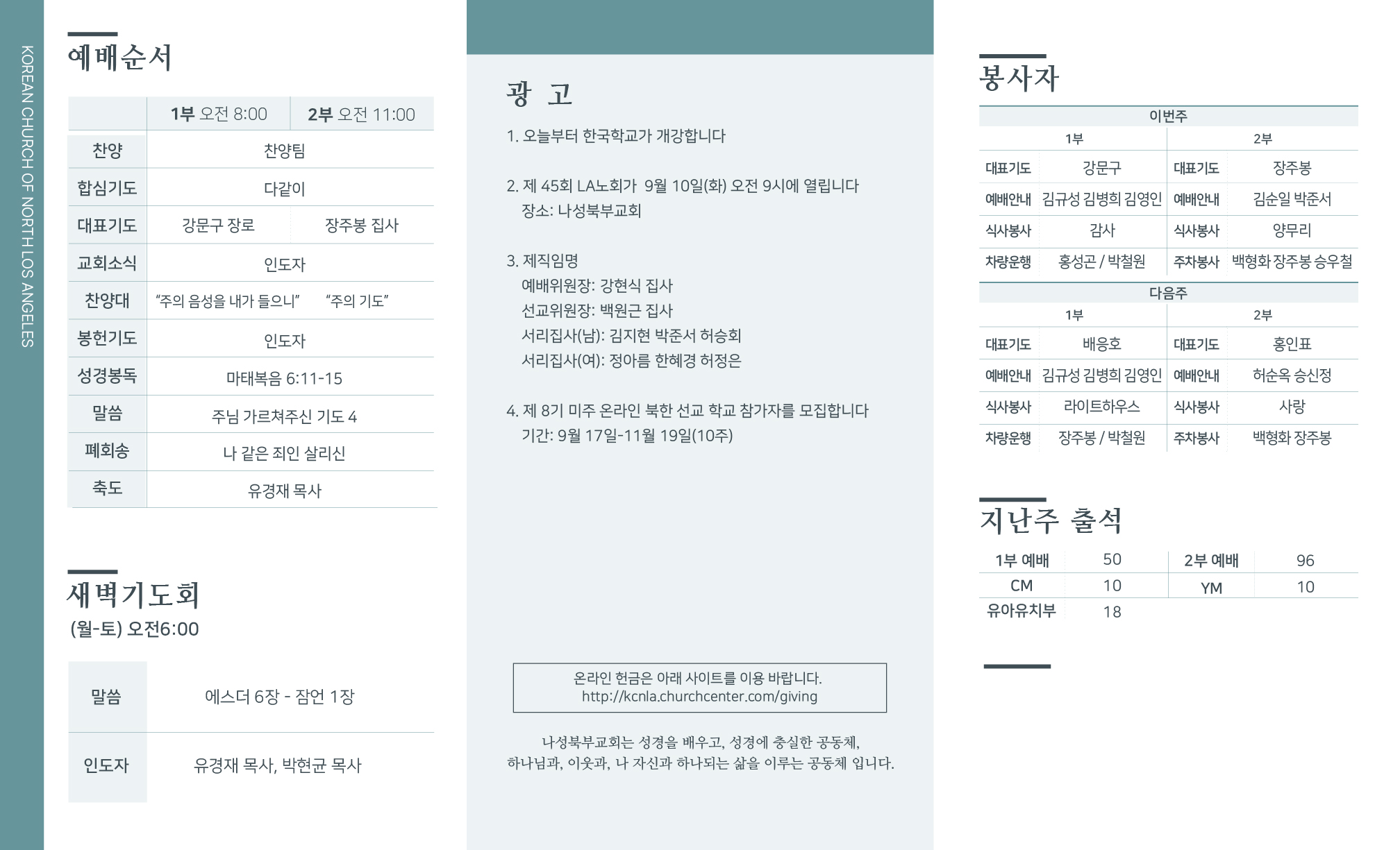 2024년 9월 8일 교회주보 페이지 정보 작성자 나성북부교회 댓글 0건 조회 3,035회 작성일 24-09-10 15:58 목록 본문 2024년 9월 8일 교회주보 이전글2024년 9월 15일 교회주보 24.09.15 다음글2024년 9월 1일 교회주보 24.09.03 목록 댓글 0 댓글목록 등록된 댓글이 없습니다.