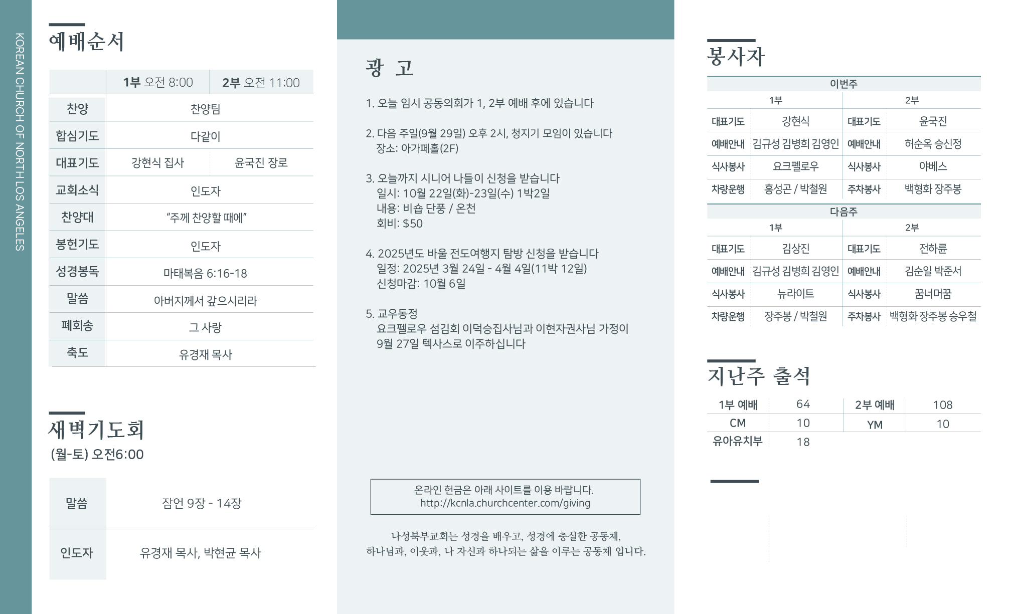 2024년 9월 22일 교회주보 페이지 정보 작성자 나성북부교회 댓글 0건 조회 2,951회 작성일 24-09-24 14:06 목록 본문 2024년 9월 22일 교회주보 이전글2024년 9월 29일 교회주보 24.10.01 다음글2024년 9월 15일 교회주보 24.09.15 목록 댓글 0 댓글목록 등록된 댓글이 없습니다.