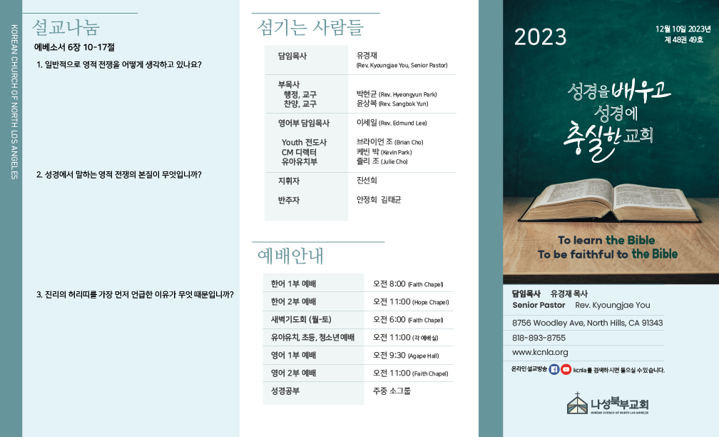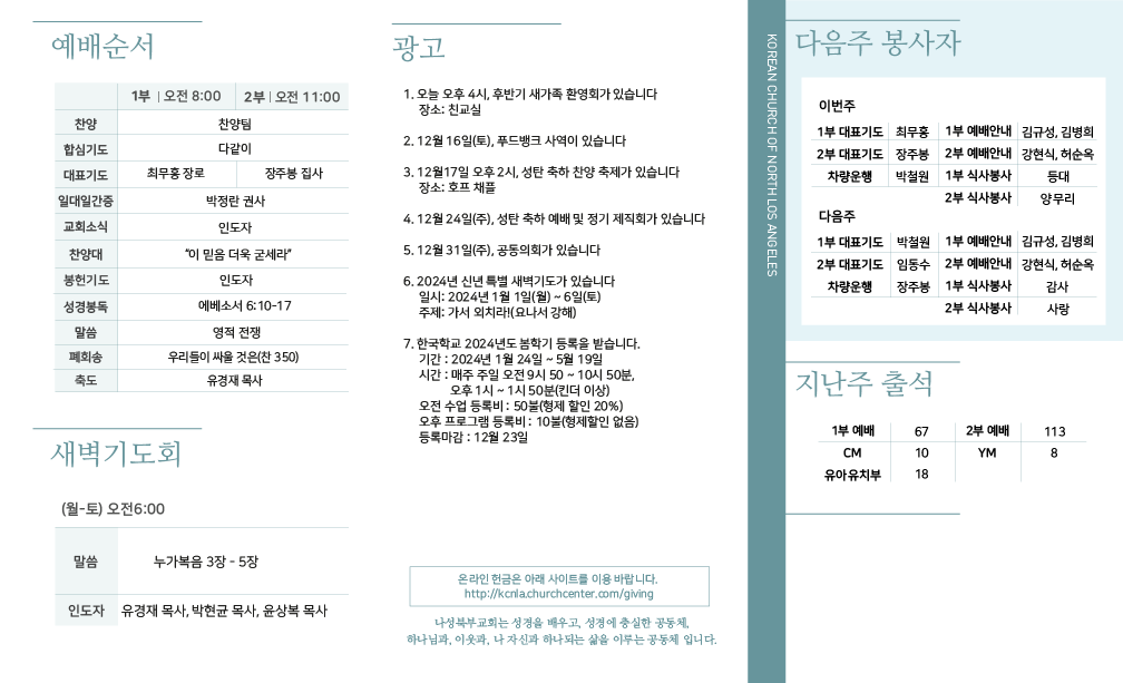 2023년 12월 10일 교회주보 페이지 정보 작성자 나성북부교회 댓글 0건 조회 4,786회 작성일 23-12-12 16:00 목록 본문 2023년 12월 10일 교회주보 이전글2023년 12월 17일 교회주보 23.12.19 다음글2023년 12월 3일 교회주보 23.12.05 목록 댓글 0 댓글목록 등록된 댓글이 없습니다.