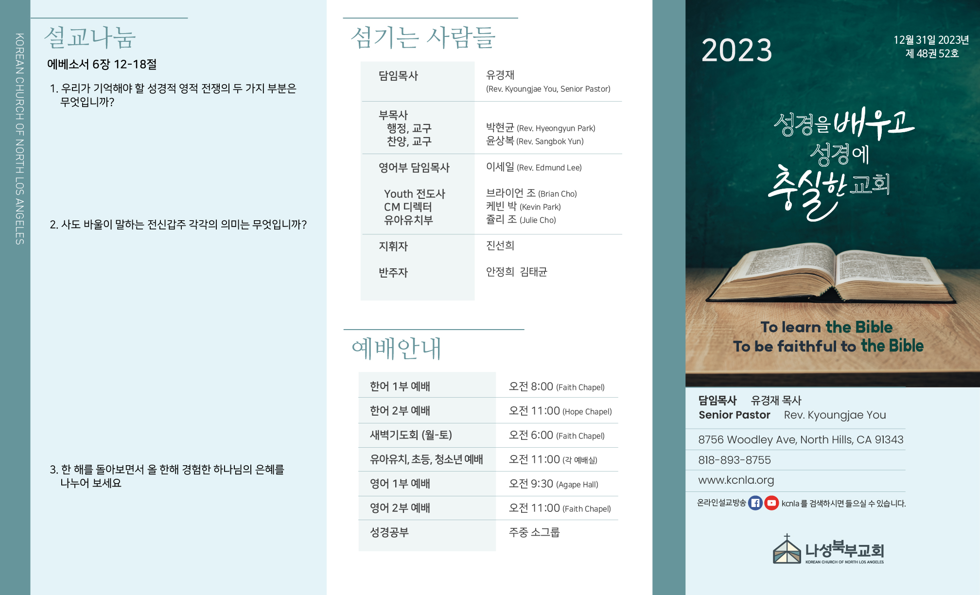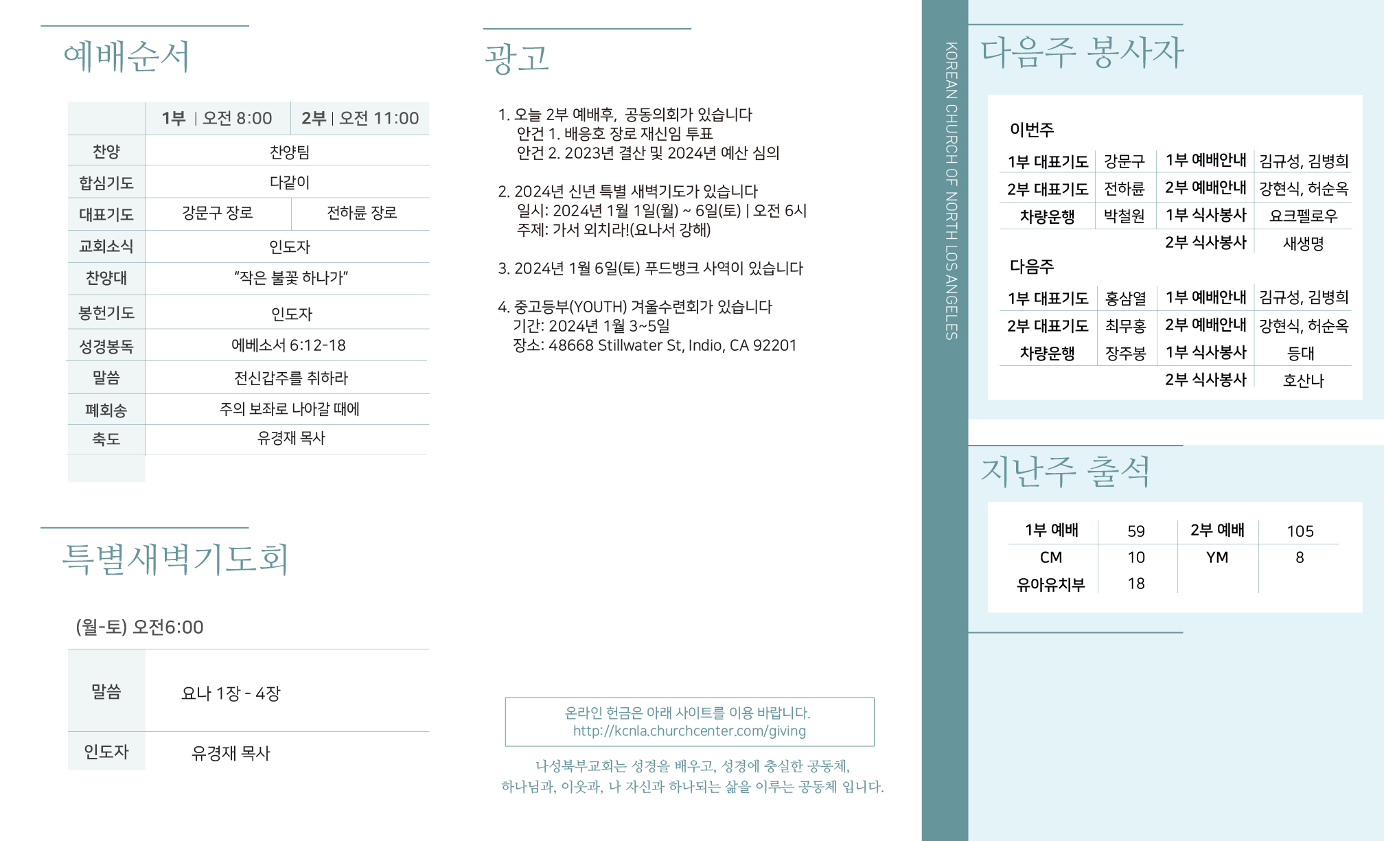 2023년 12월 31일 교회주보 페이지 정보 작성자 나성북부교회 댓글 0건 조회 4,676회 작성일 24-01-02 16:29 목록 본문 2023년 12월 31일 교회주보 이전글2024년 1월 7일 교회주보 24.01.07 다음글2023년 12월 24일 교회소식 23.12.26 목록 댓글 0 댓글목록 등록된 댓글이 없습니다.