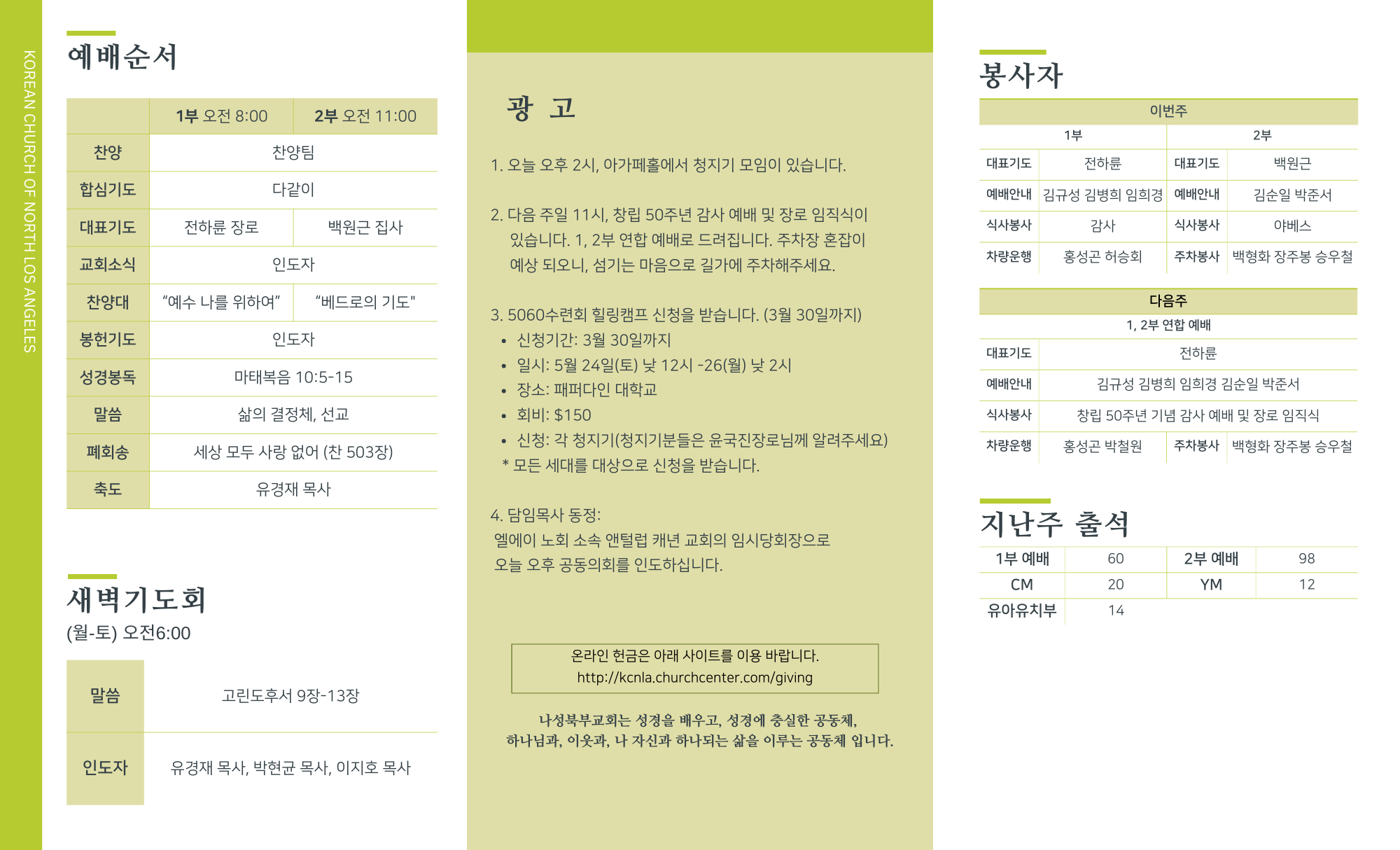 2025년 3월 16일 교회주보 페이지 정보 작성자 나성북부교회 댓글 0건 조회 2,901회 작성일 25-03-15 10:59 목록 본문 2025년 3월 16일 교회주보 이전글2025년 3월 30일 교회주보 25.03.29 다음글2025년 3월 9일 교회주보 25.03.11 목록 댓글 0 댓글목록 등록된 댓글이 없습니다.