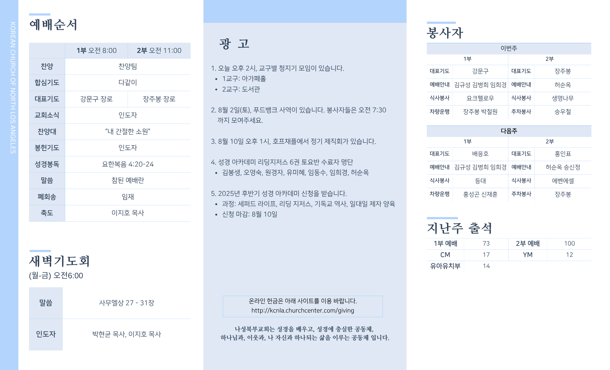 2025년 7월 27일 교회주보 페이지 정보 작성자 나성북부교회 댓글 0건 조회 1,548회 작성일 25-07-26 09:50 목록 본문 2025년 7월 27일 교회주보 이전글2025년 8월 3일 교회주보 25.08.02 다음글2025년 7월 20일 교회주보 25.07.19 목록 댓글 0 댓글목록 등록된 댓글이 없습니다.