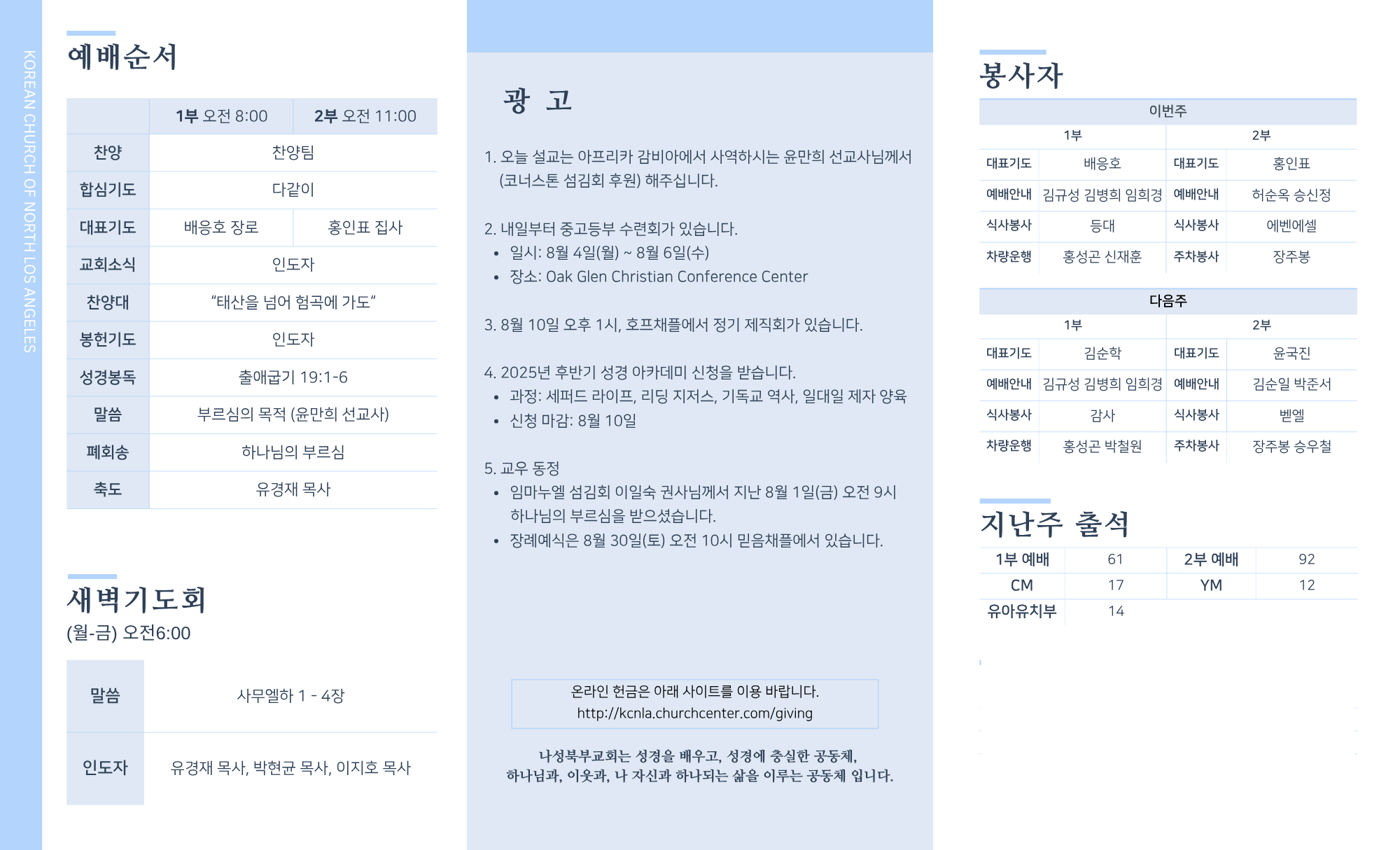 2025년 8월 3일 교회주보 페이지 정보 작성자 나성북부교회 댓글 0건 조회 1,738회 작성일 25-08-02 11:21 목록 본문 2025년 8월 3일 교회주보 이전글2025년 8월 10일 교회주보 25.08.09 다음글2025년 7월 27일 교회주보 25.07.26 목록 댓글 0 댓글목록 등록된 댓글이 없습니다.
