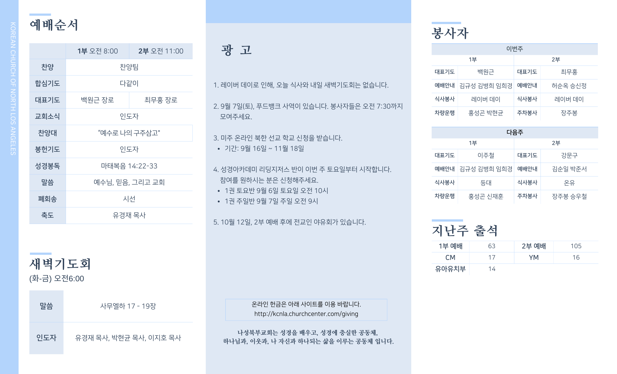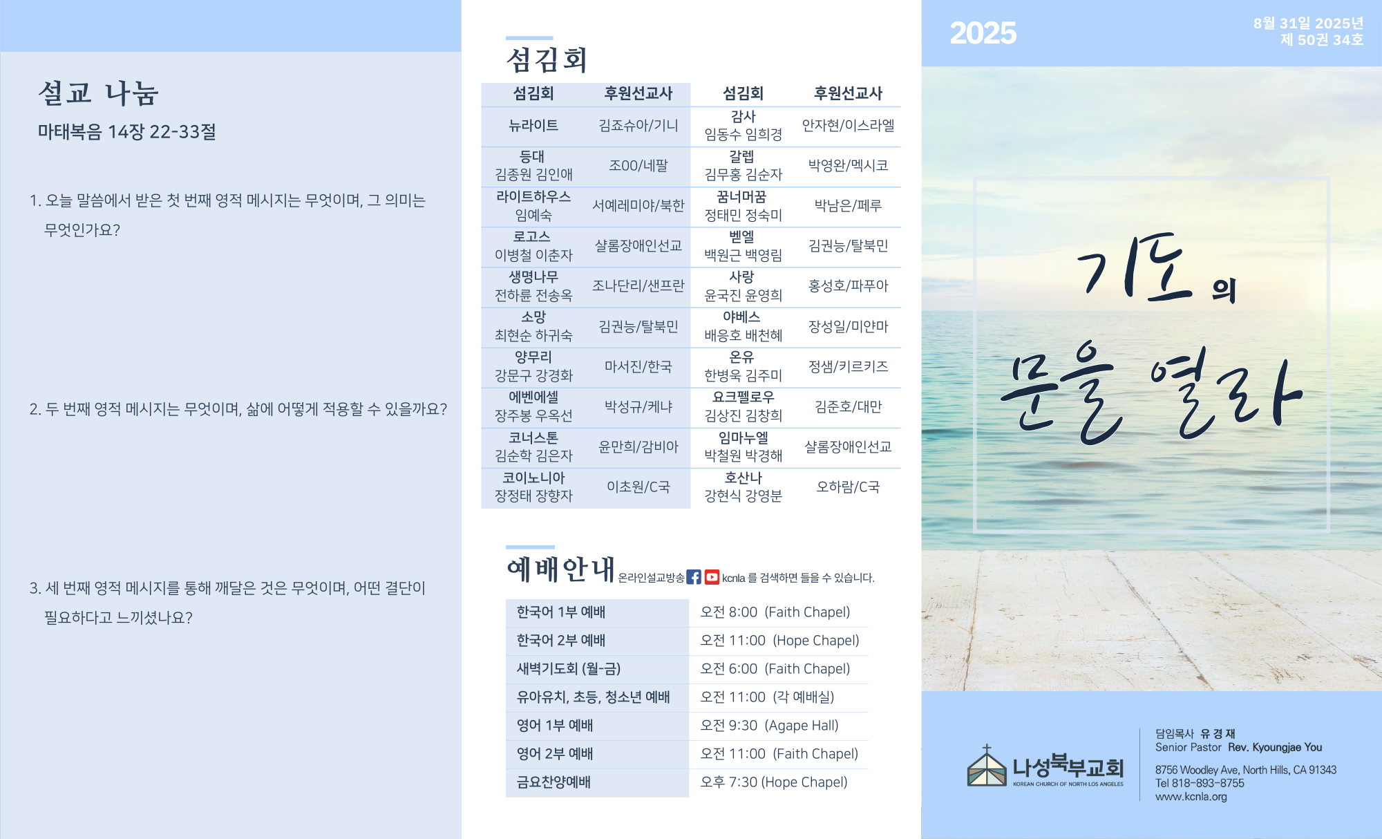 2025년 8월 31일 교회주보 페이지 정보 작성자 나성북부교회 댓글 0건 조회 1,830회 작성일 25-08-30 11:09 목록 본문 2025년 8월 31일 교회주보 이전글2025년 9월 7일 교회주보 25.09.06 다음글2025년 8월 24일 교회주보 25.08.23 목록 댓글 0 댓글목록 등록된 댓글이 없습니다.