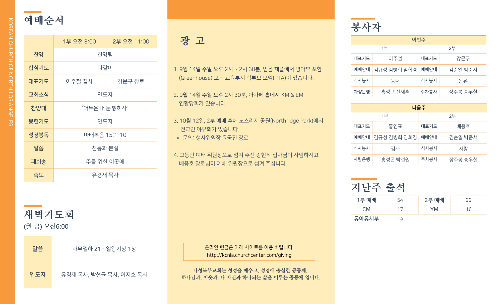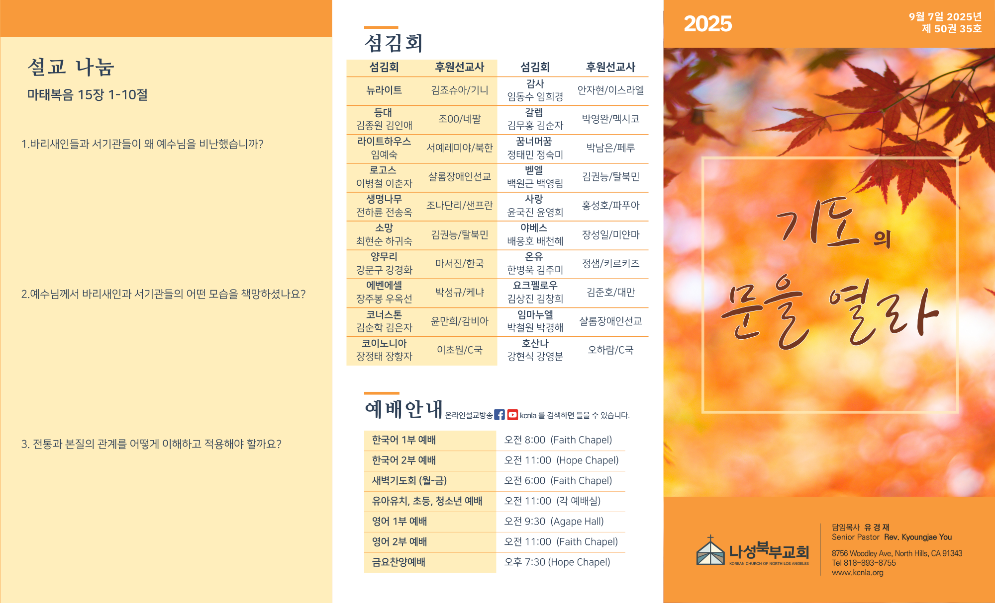 2025년 9월 7일 교회주보 페이지 정보 작성자 나성북부교회 댓글 0건 조회 1,163회 작성일 25-09-06 10:54 목록 본문 2025년 9월 7일 교회주보 이전글2025년 9월 14일 교회주보 25.09.13 다음글2025년 8월 31일 교회주보 25.08.30 목록 댓글 0 댓글목록 등록된 댓글이 없습니다.