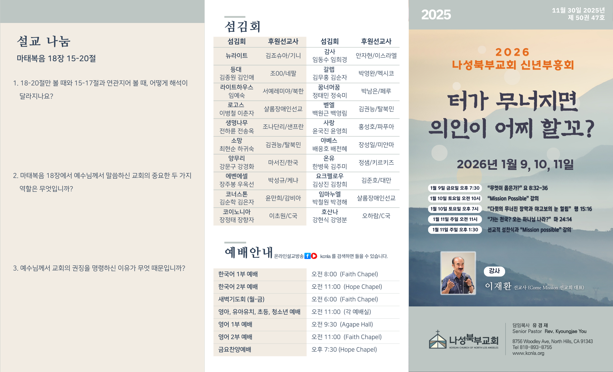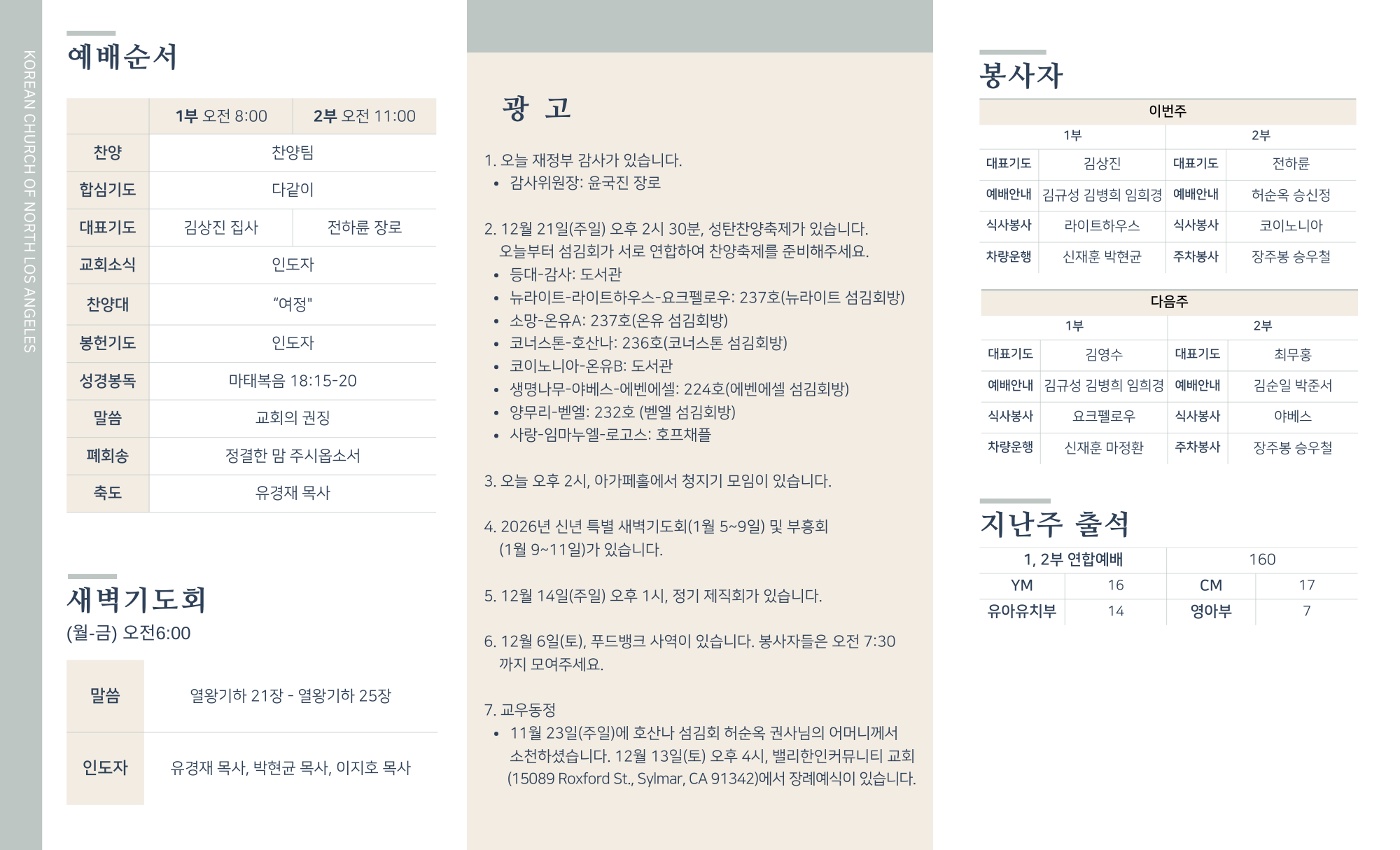 2025년 11월 30일 교회주보 페이지 정보 작성자 나성북부교회 댓글 0건 조회 431회 작성일 25-11-29 11:33 목록 본문 2025년 11월 30일 교회주보 이전글2025년 12월 7일 교회주보 25.12.06 다음글2025년 11월 23일 교회주보 25.11.22 목록 댓글 0 댓글목록 등록된 댓글이 없습니다.