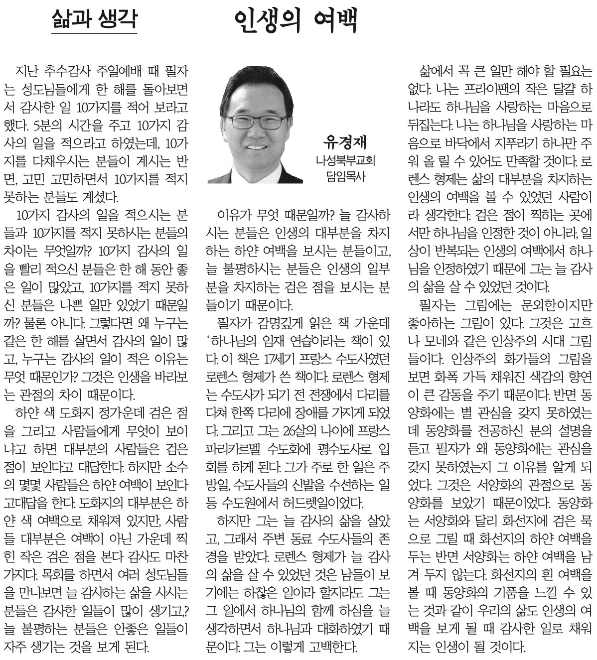 인생의 여백 (미주한국일보 2024년 11월 28일 칼럼) Publish on December 04,2024 | 나성북부교회