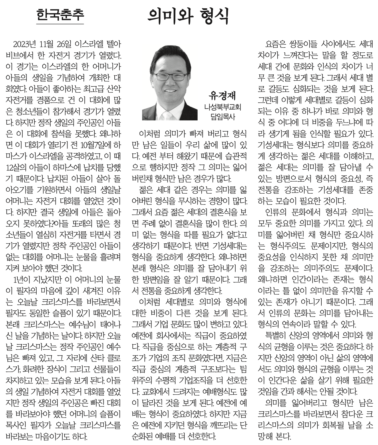 의미와 형식 (미주한국일보 2024년 12월 27일 칼럼) Publish on December 29,2024 | 나성북부교회