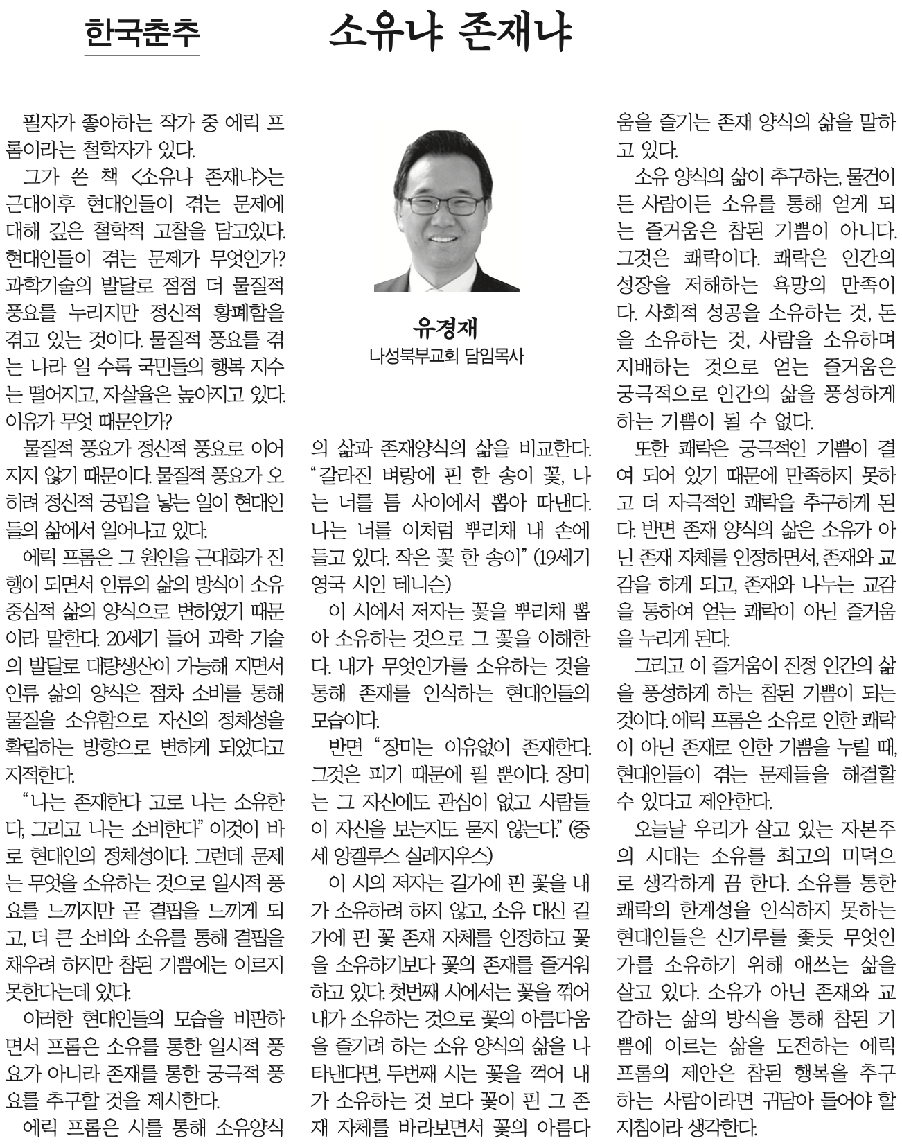 소유냐 존재냐 (미주한국일보 2025년 2월 21일 칼럼) Publish on February 21,2025 | 나성북부교회
